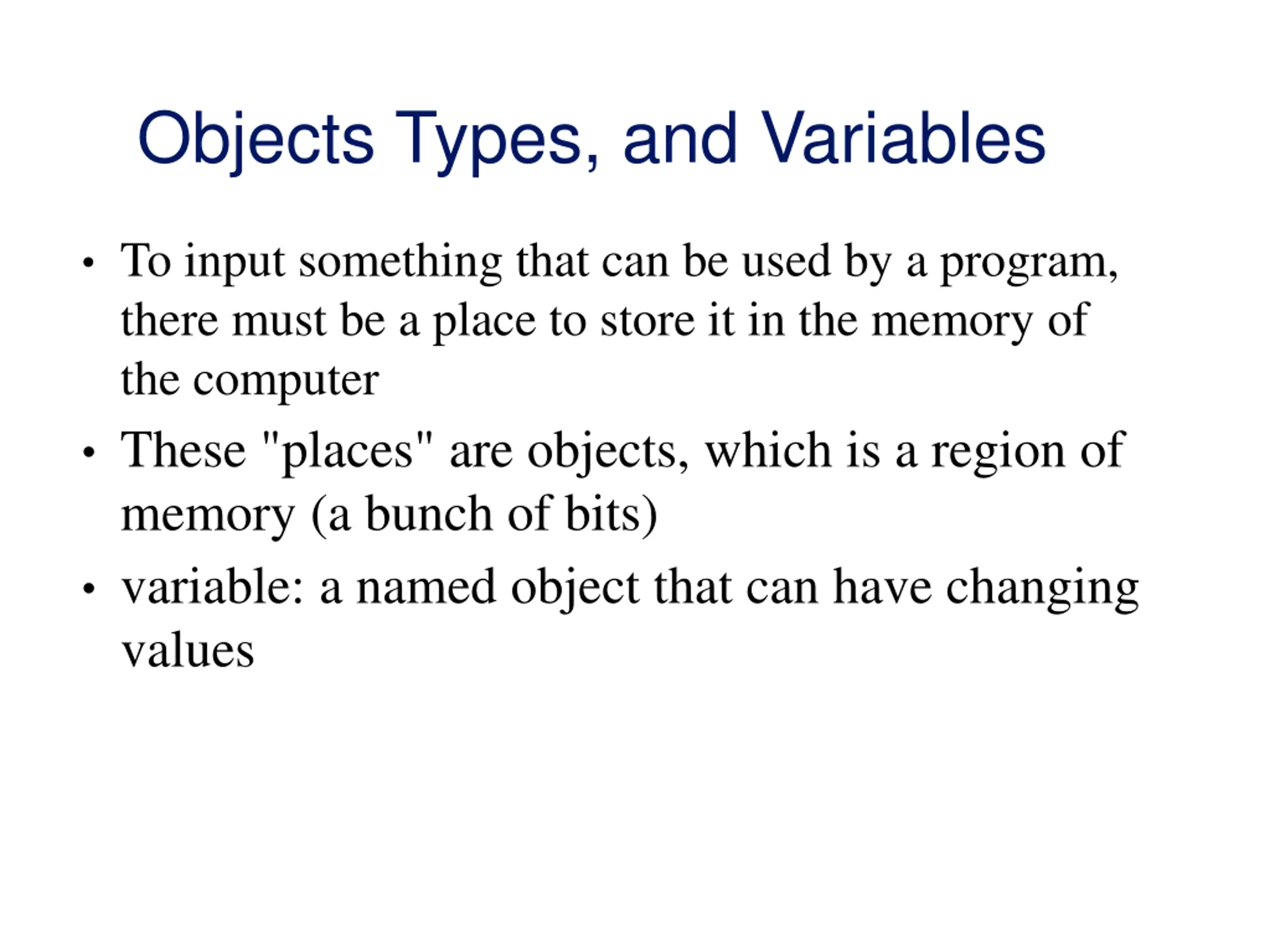 Objects Types, and Variables To input something that can be used by a program, there must be a place to store it in the memory of the computer These "places" are objects, which is a region of memory (a bunch of bits) variable: a named object that can have changing values