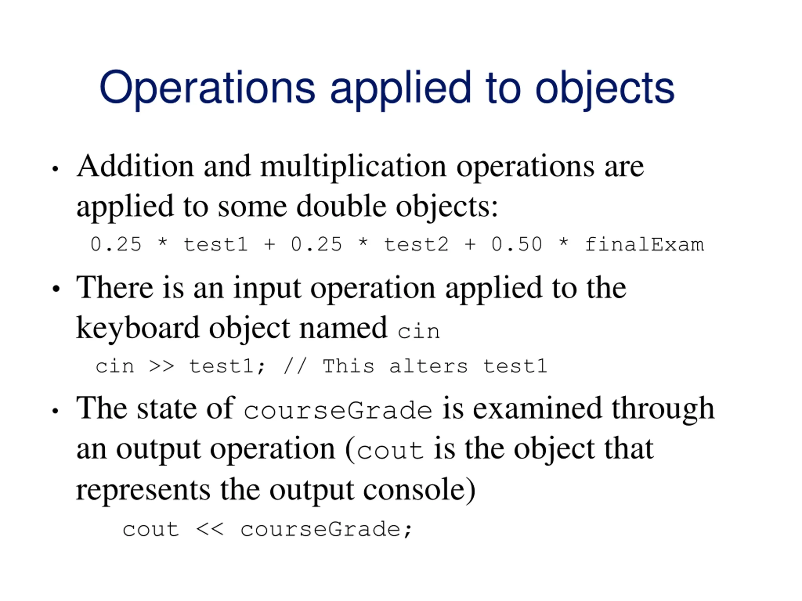 Operations applied to objects Addition and multiplication operations are applied to some double objects: 0.25 * test1 + 0.25 * test2 + 0.50 * finalExam There is an input operation applied to the keyboard object named cin cin >> test1; // This alters test1 The state of courseGrade is examined through an output operation (cout is the object that represents the output console) cout << courseGrade;