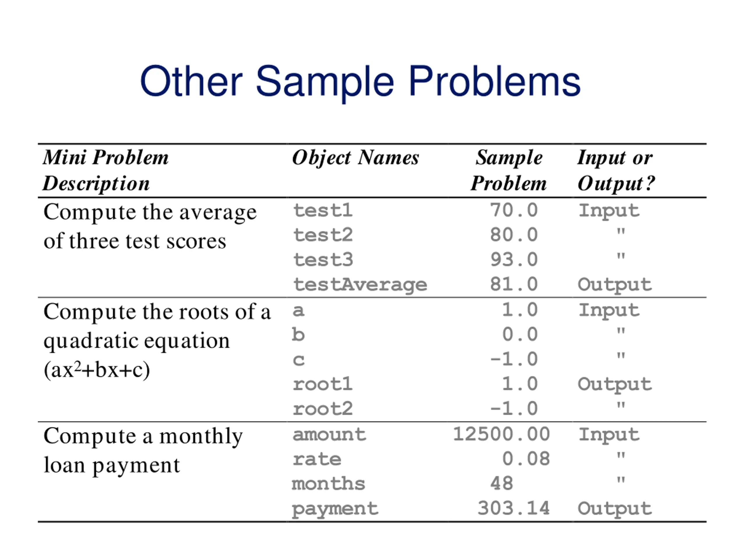 Other Sample Problems Mini Problem Description Compute the average of three test scores Object Names Sample Problem 70.0 80.0 93.0 81.0 1.0 0.0 -1.0 1.0 -1.0 12500.00 0.08 48 303.14 Input or Output? Input " " Output Input " " Output " Input " " Output test1 test2 test3 testAverage a b c root1 root2 amount rate months payment Compute the roots of a quadratic equation (ax2+bx+c) Compute a monthly loan payment