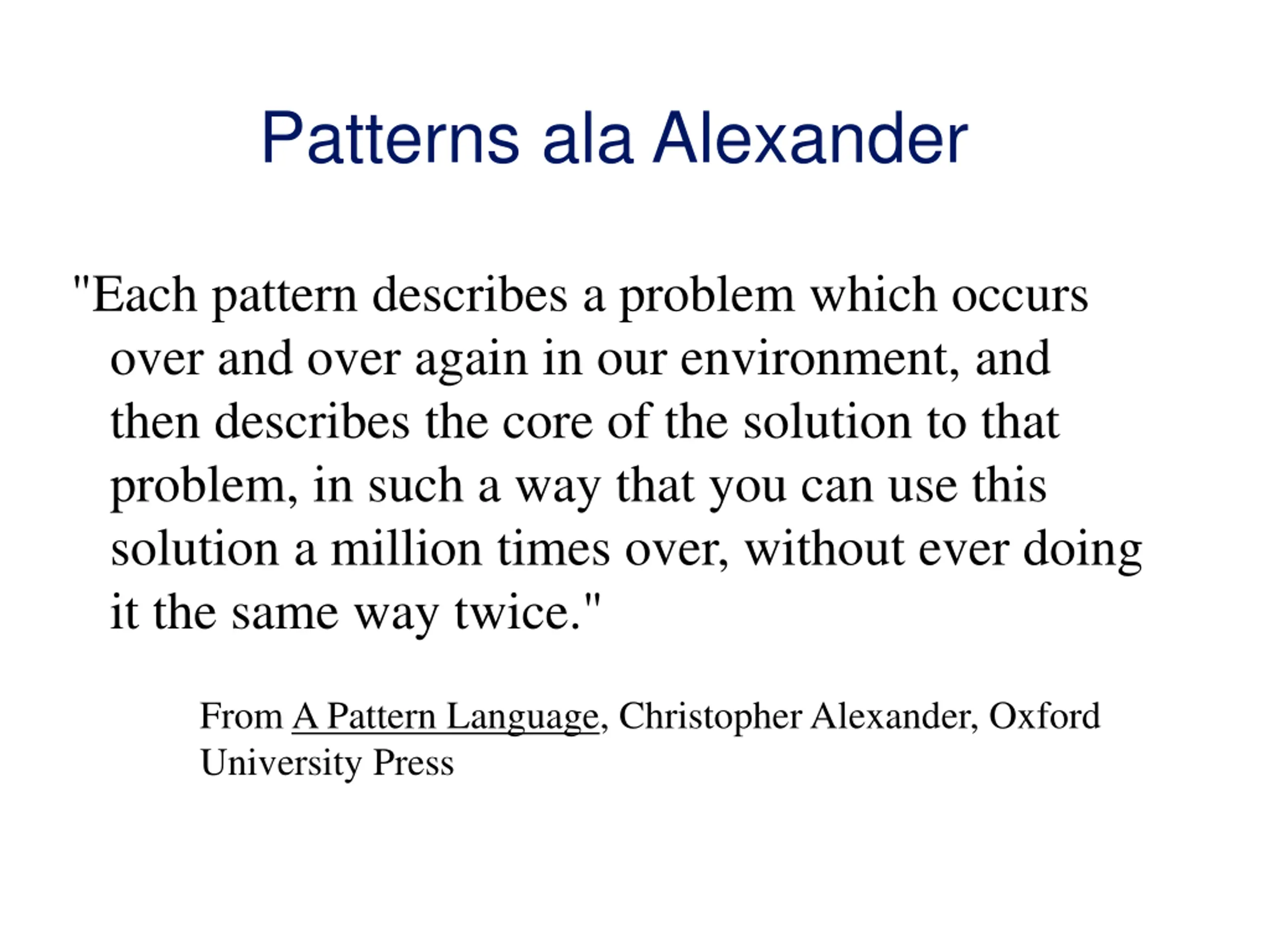 Patterns ala Alexander "Each pattern describes a problem which occurs over and over again in our environment, and then describes the core of the solution to that problem, in such a way that you can use this solution a million times over, without ever doing it the same way twice." From A Pattern Language, Christopher Alexander, Oxford University Press