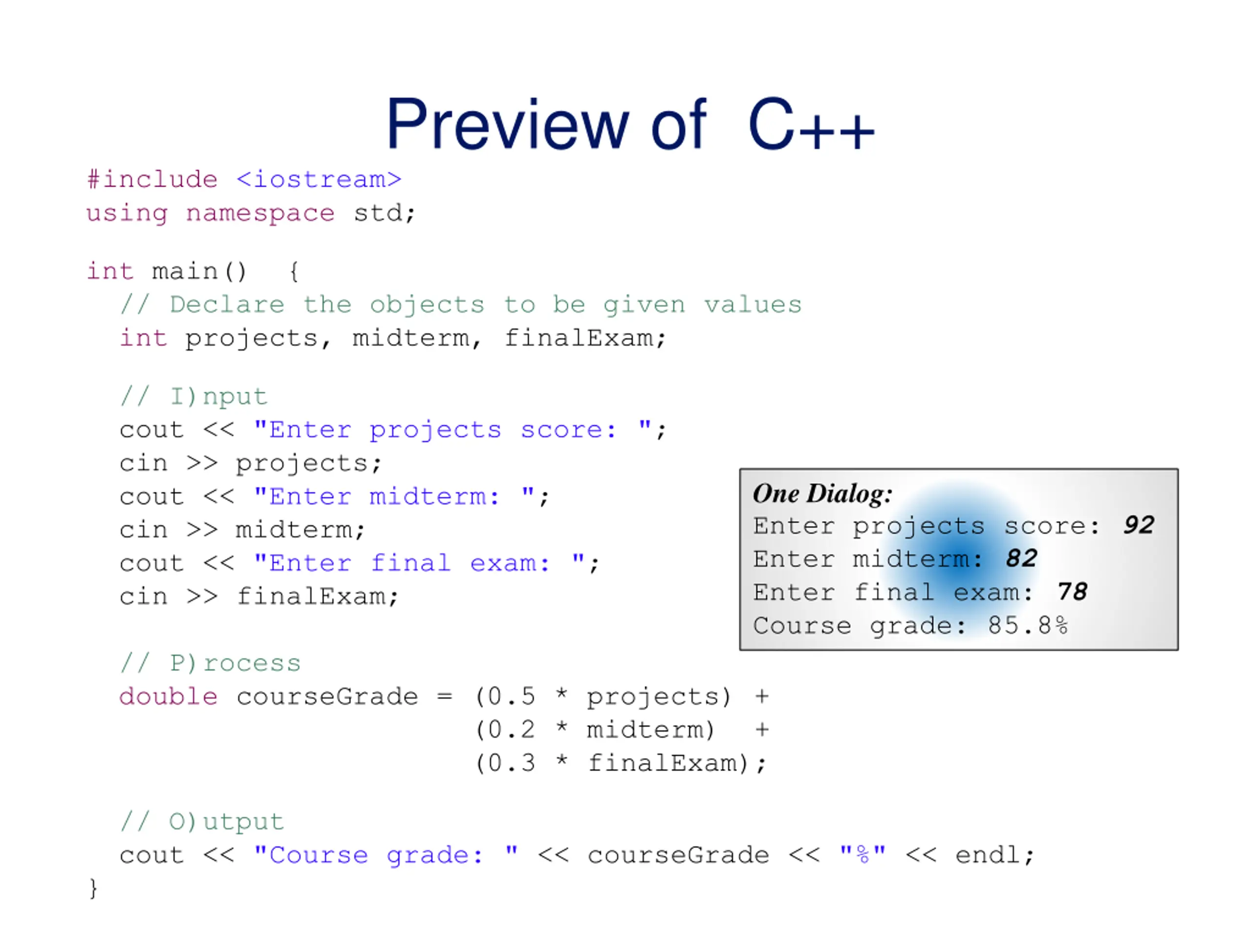 Preview of C++ #include <iostream> using namespace std; int main() { // Declare the objects to be given values int projects, midterm, finalExam; // I)nput cout << "Enter projects score: "; cin >> projects; cout << "Enter midterm: "; cin >> midterm; cout << "Enter final exam: "; cin >> finalExam; One Dialog: Enter projects score: 92 Enter midterm: 82 Enter final exam: 78 Course grade: 85.8% // P)rocess double courseGrade = (0.5 * projects) + (0.2 * midterm) + (0.3 * finalExam); // O)utput cout << "Course grade: " << courseGrade << "%" << endl; }