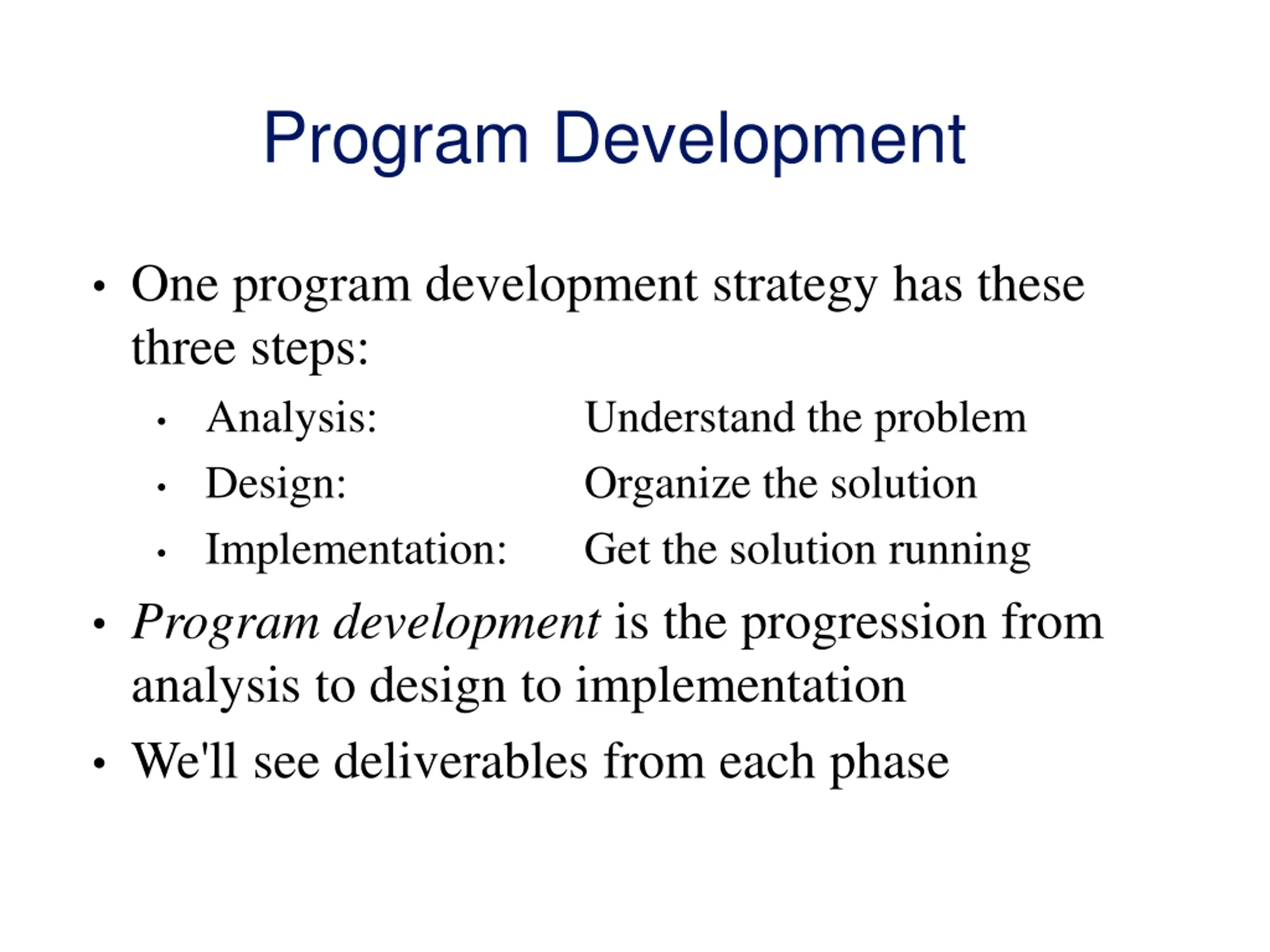 Program Development One program development strategy has these three steps: Analysis: Understand the problem Design: Organize the solution Implementation: Get the solution running Program development is the progression from analysis to design to implementation We'll see deliverables from each phase