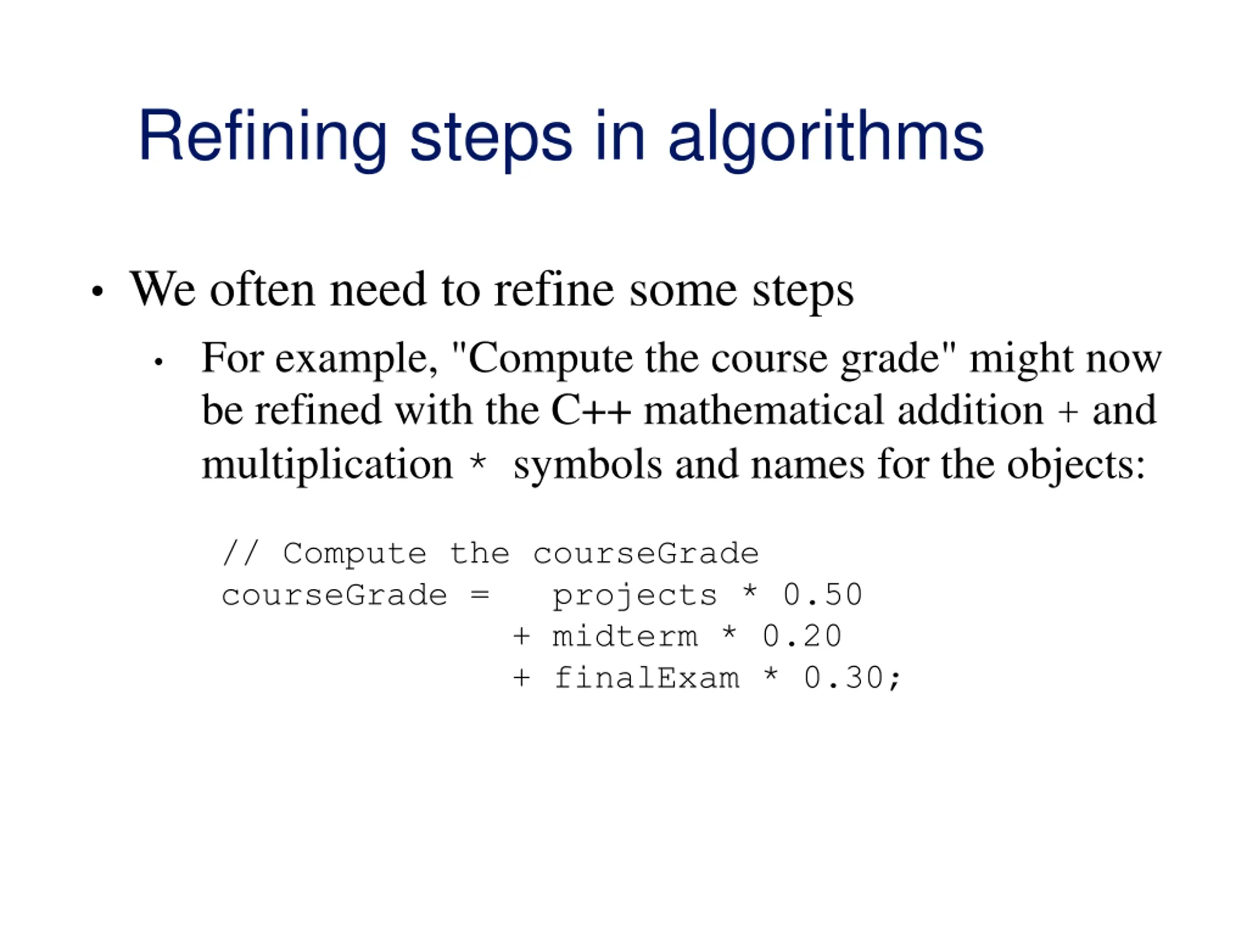 Refining steps in algorithms We often need to refine some steps For example, "Compute the course grade" might now be refined with the C++ mathematical addition + and multiplication * symbols and names for the objects: // Compute the courseGrade courseGrade = projects * 0.50 + midterm * 0.20 + finalExam * 0.30;