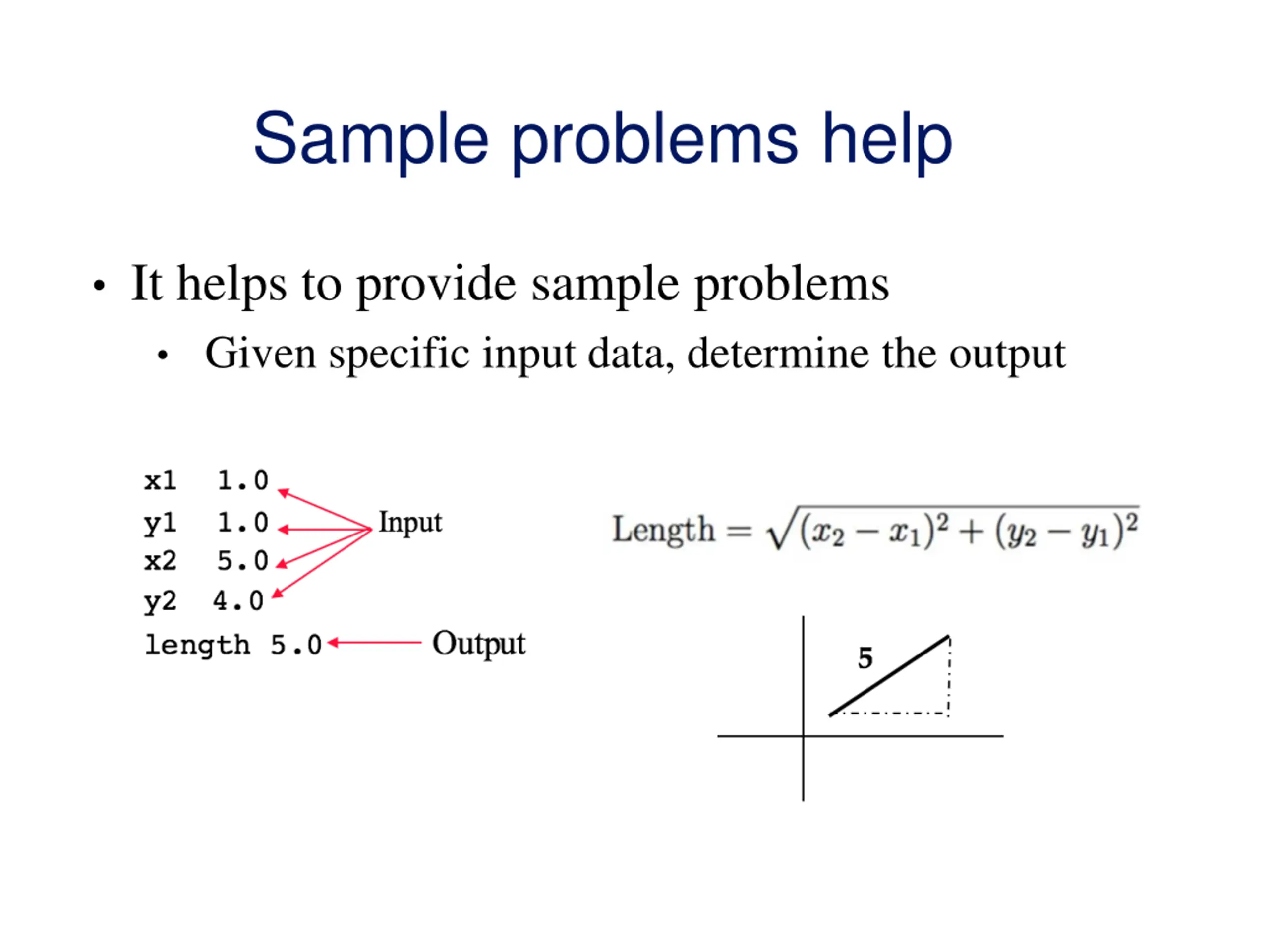 Sample problems help It helps to provide sample problems Given specific input data, determine the output x1 1.0 y1 1.0 x2 5.0 y2 4.0 length 5.0 Output Input 5