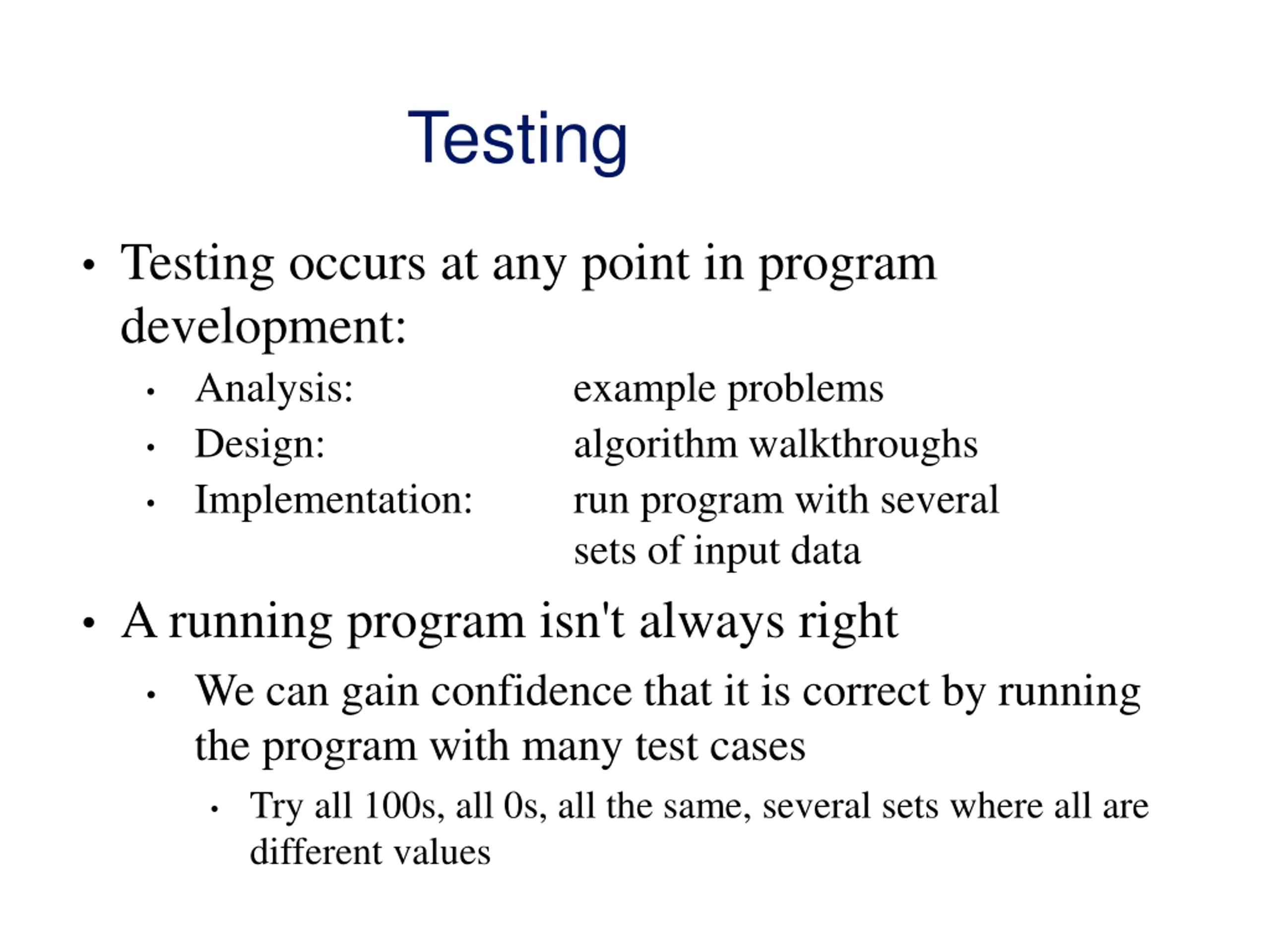 Testing Testing occurs at any point in program development: Analysis: Design: Implementation: sets of input data A running program isn't always right We can gain confidence that it is correct by running the program with many test cases Try all 100s, all 0s, all the same, several sets where all are different values example problems algorithm walkthroughs run program with several