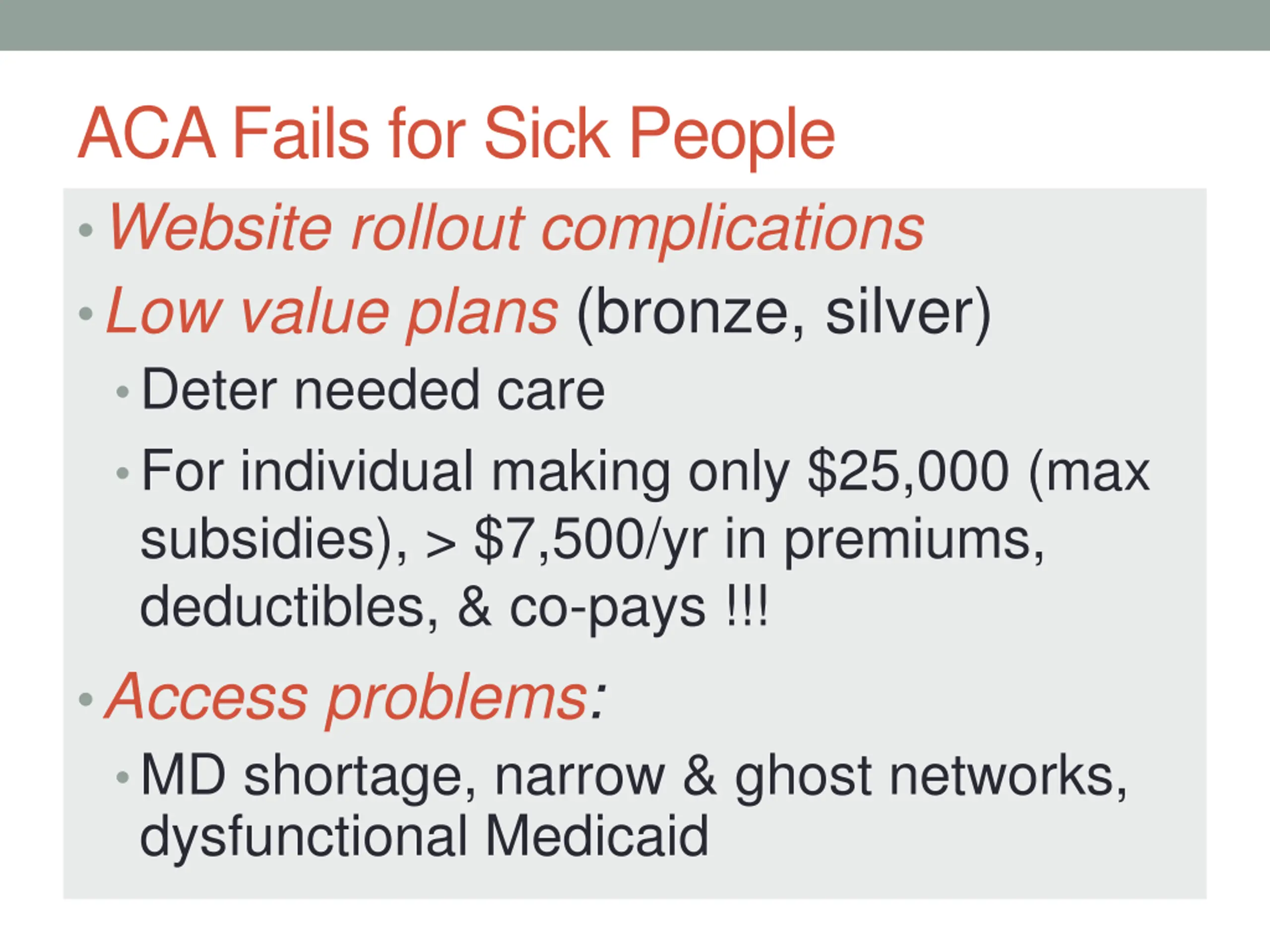 ACA Fails for Sick People Website rollout complications Low value plans (bronze, silver) Deter needed care For individual making only $25,000 (max subsidies), > $7,500/yr in premiums, deductibles, & co-pays !!! Access problems: MD shortage, narrow & ghost networks, dysfunctional Medicaid