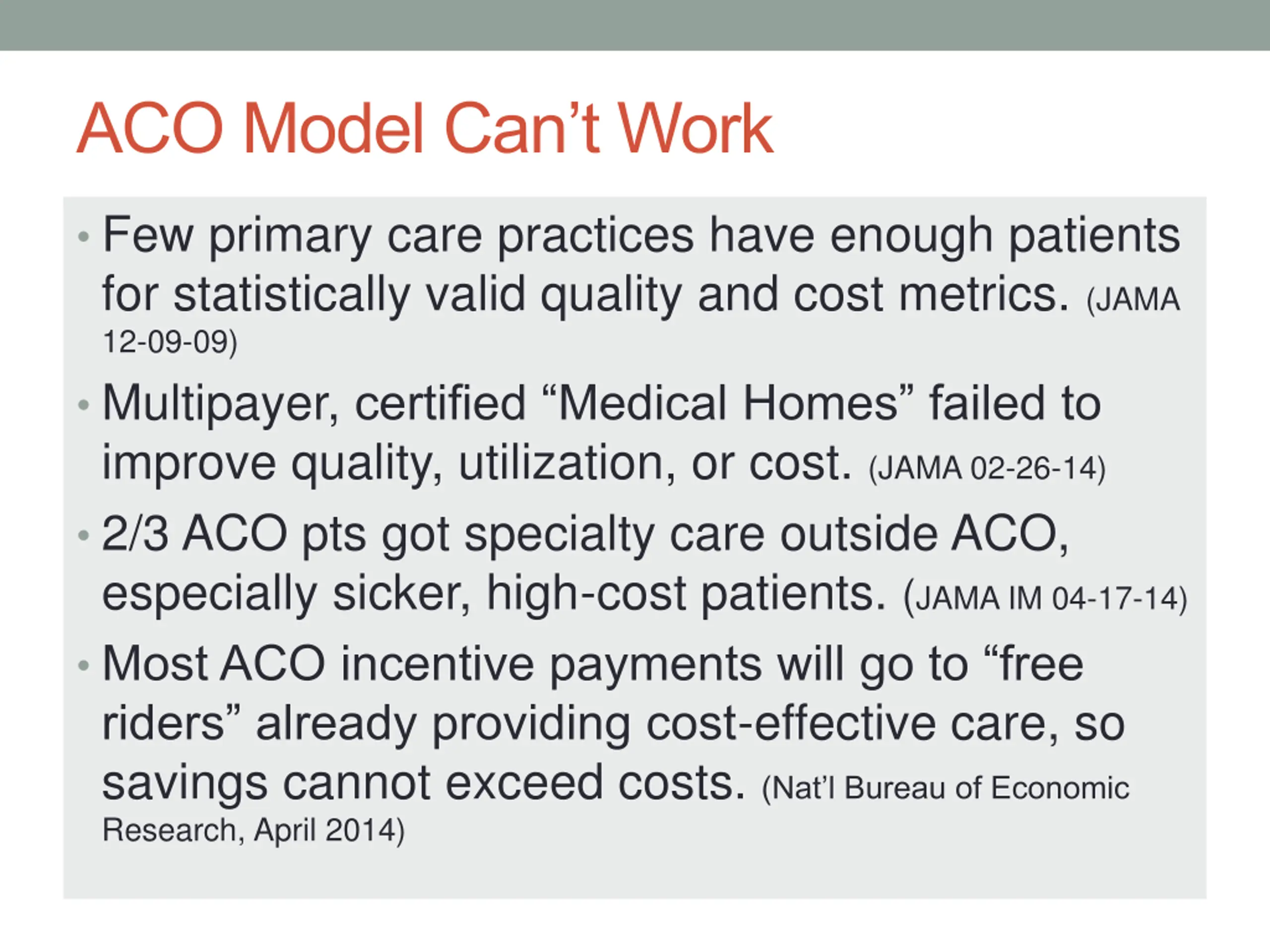 ACO Model Cant Work Few primary care practices have enough patients for statistically valid quality and cost metrics. (JAMA 12-09-09) Multipayer, certified Medical Homes failed to improve quality, utilization, or cost. (JAMA 02-26-14) 2/3 ACO pts got specialty care outside ACO, especially sicker, high-cost patients. (JAMA IM 04-17-14) Most ACO incentive payments will go to free riders already providing cost-effective care, so savings cannot exceed costs. (Nat l Bureau of Economic Research, April 2014)