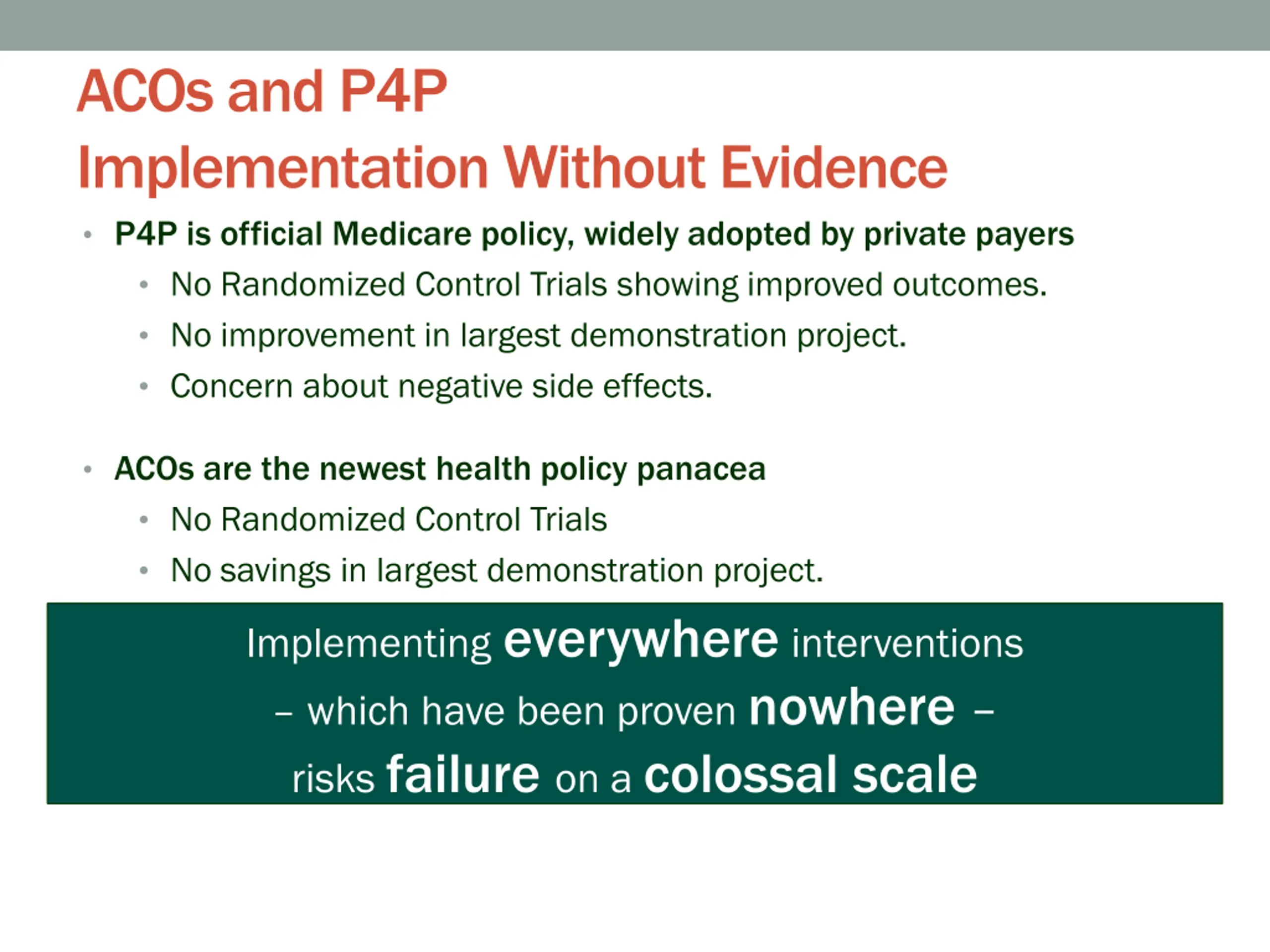 ACOs and P4P Implementation Without Evidence P4P is official Medicare policy, widely adopted by private payers No Randomized Control Trials showing improved outcomes. No improvement in largest demonstration project. Concern about negative side effects. ACOs are the newest health policy panacea No Randomized Control Trials No savings in largest demonstration project. Disturbing HMO experience. Implementingeverywhereinterventions which have been proven nowhere risksfailure on a colossal scale