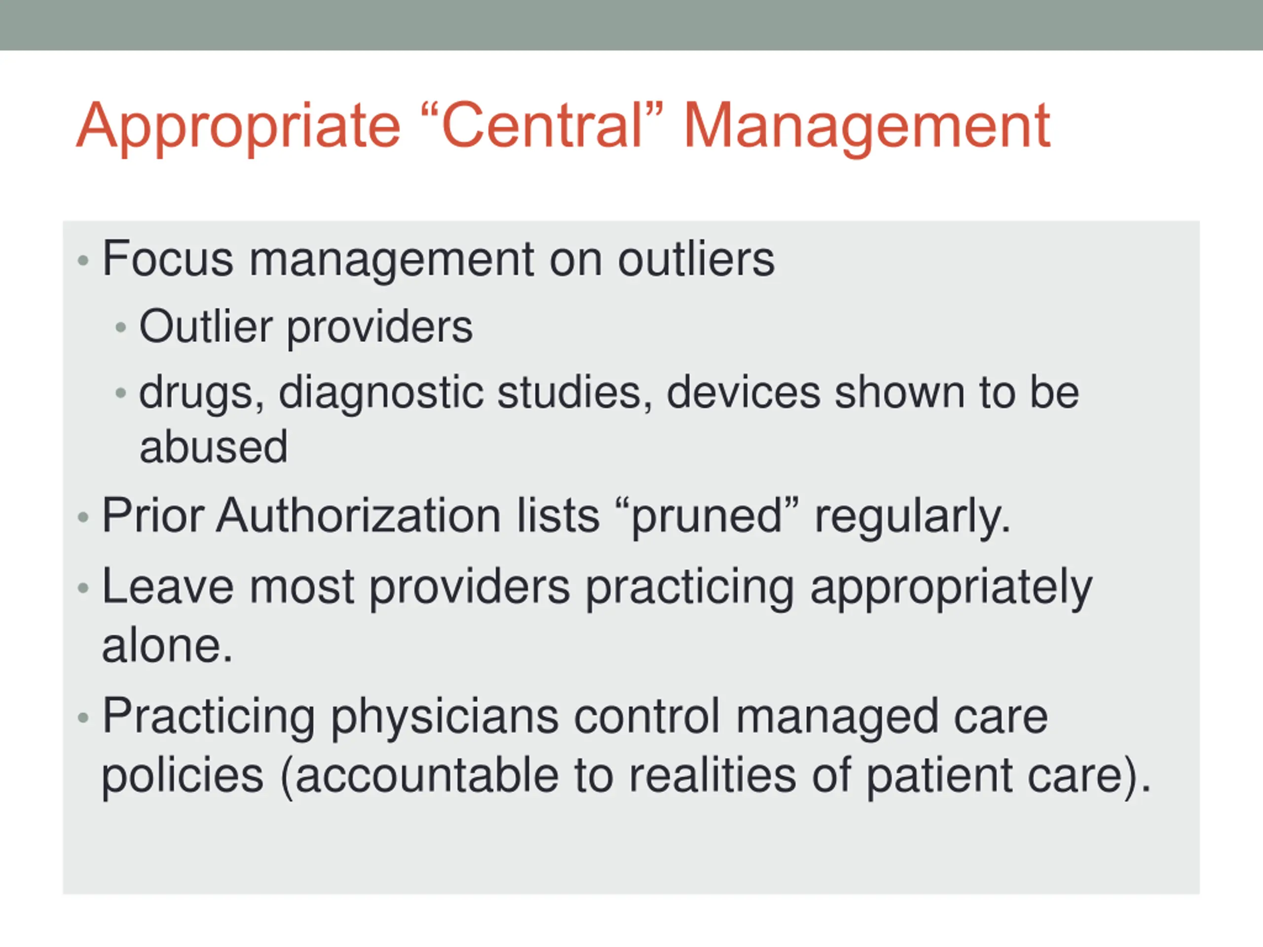 Appropriate Central Management Focus management on outliers Outlier providers drugs, diagnostic studies, devices shown to be abused Prior Authorization lists pruned regularly. Leave most providers practicing appropriately alone. Practicing physicians control managed care policies (accountable to realities of patient care).