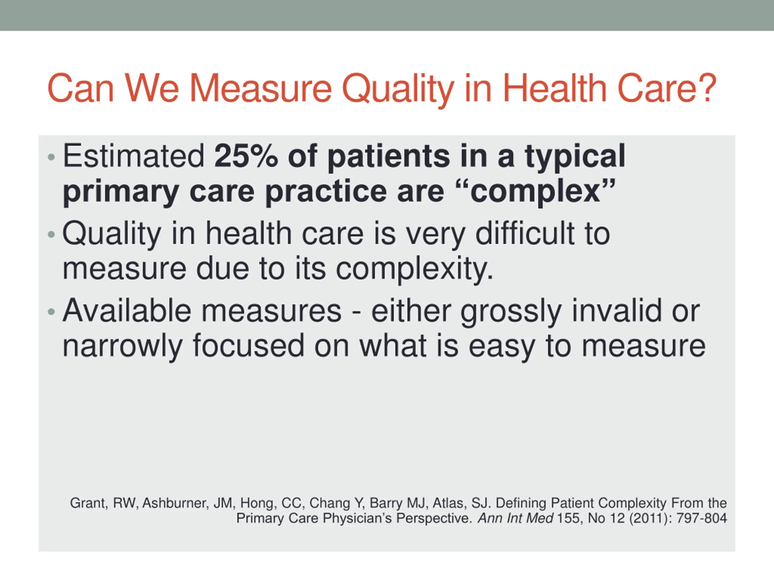 Can We Measure Quality in Health Care? Estimated 25% of patients in a typical primary care practice are complex Quality in health care is very difficult to measure due to its complexity. Available measures - either grossly invalid or narrowly focused on what is easy to measure Grant, RW, Ashburner, JM, Hong, CC, Chang Y, Barry MJ, Atlas, SJ. Defining Patient Complexity From the Primary Care Physician s Perspective. Ann Int Med 155, No 12 (2011): 797-804