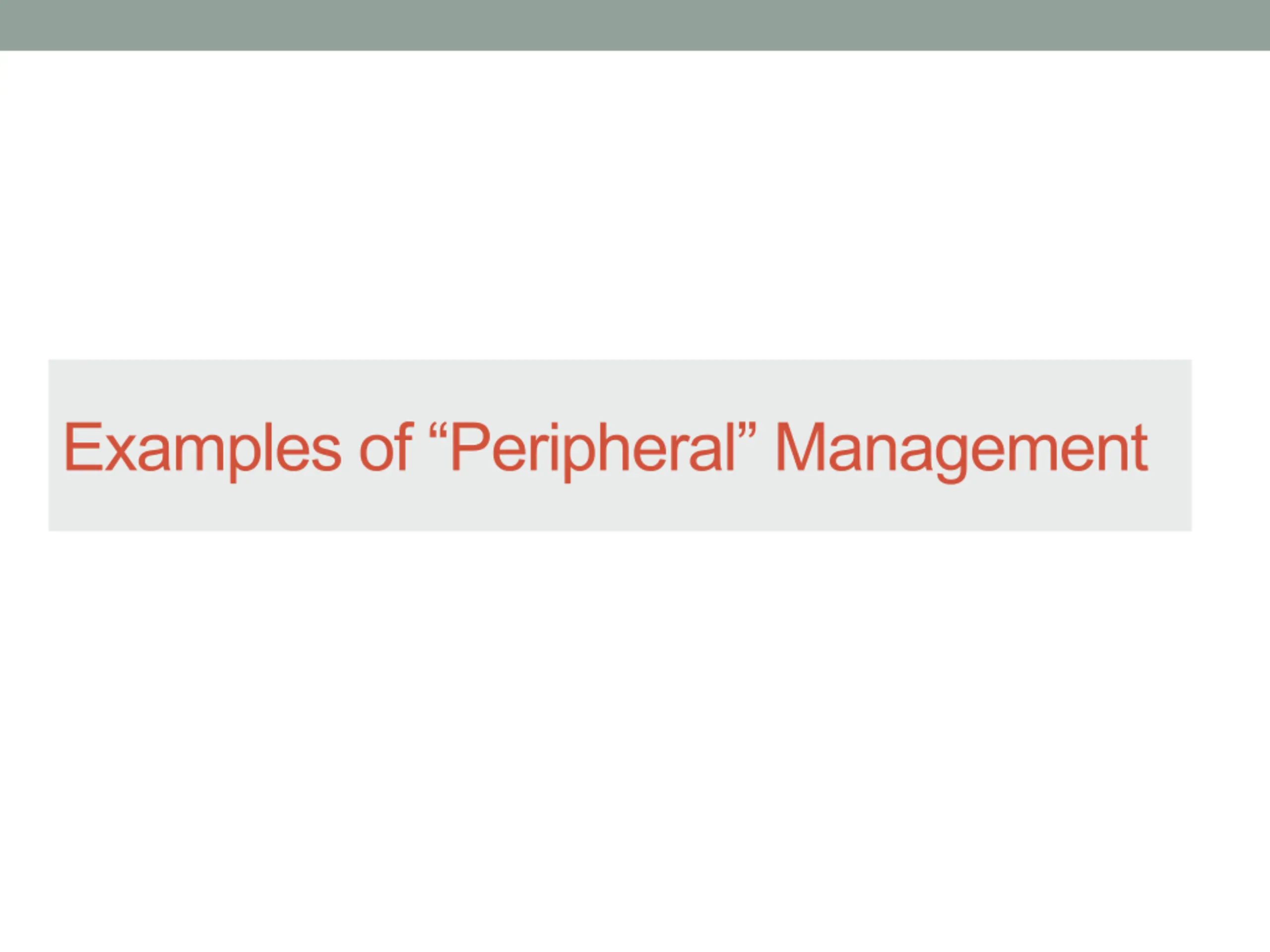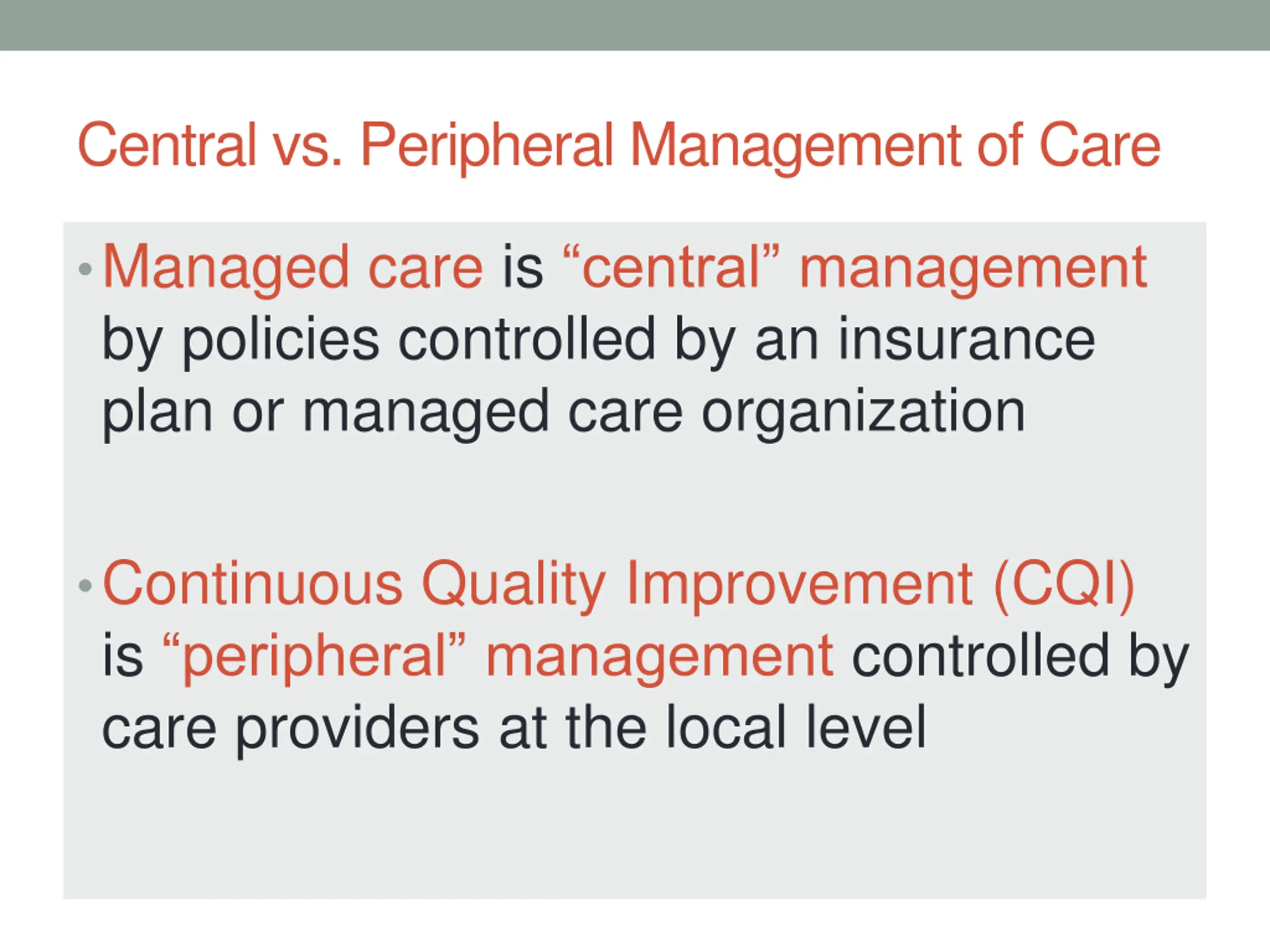 Central vs. Peripheral Management of Care Managed care is central management by policies controlled by an insurance plan or managed care organization Continuous Quality Improvement (CQI) is peripheral management controlled by care providers at the local level