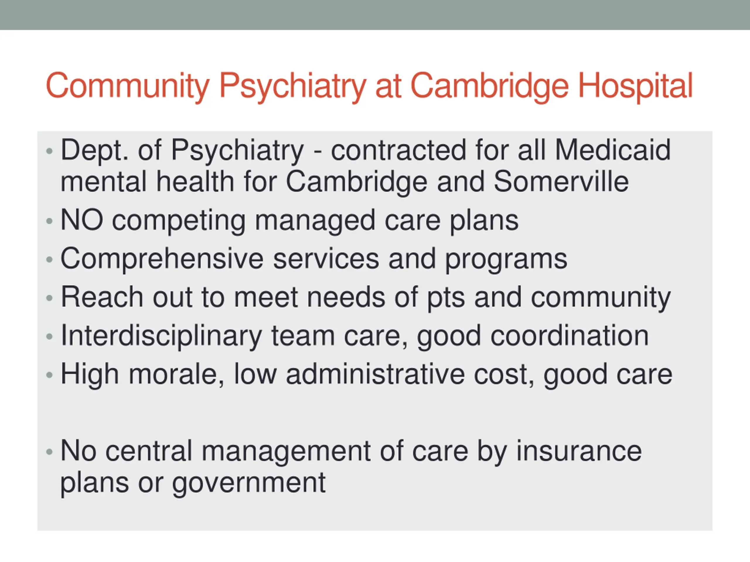 Community Psychiatry at Cambridge Hospital Dept. of Psychiatry - contracted for all Medicaid mental health for Cambridge and Somerville NO competing managed care plans Comprehensive services and programs Reach out to meet needs of pts and community Interdisciplinary team care, good coordination High morale, low administrative cost, good care No central management of care by insurance plans or government