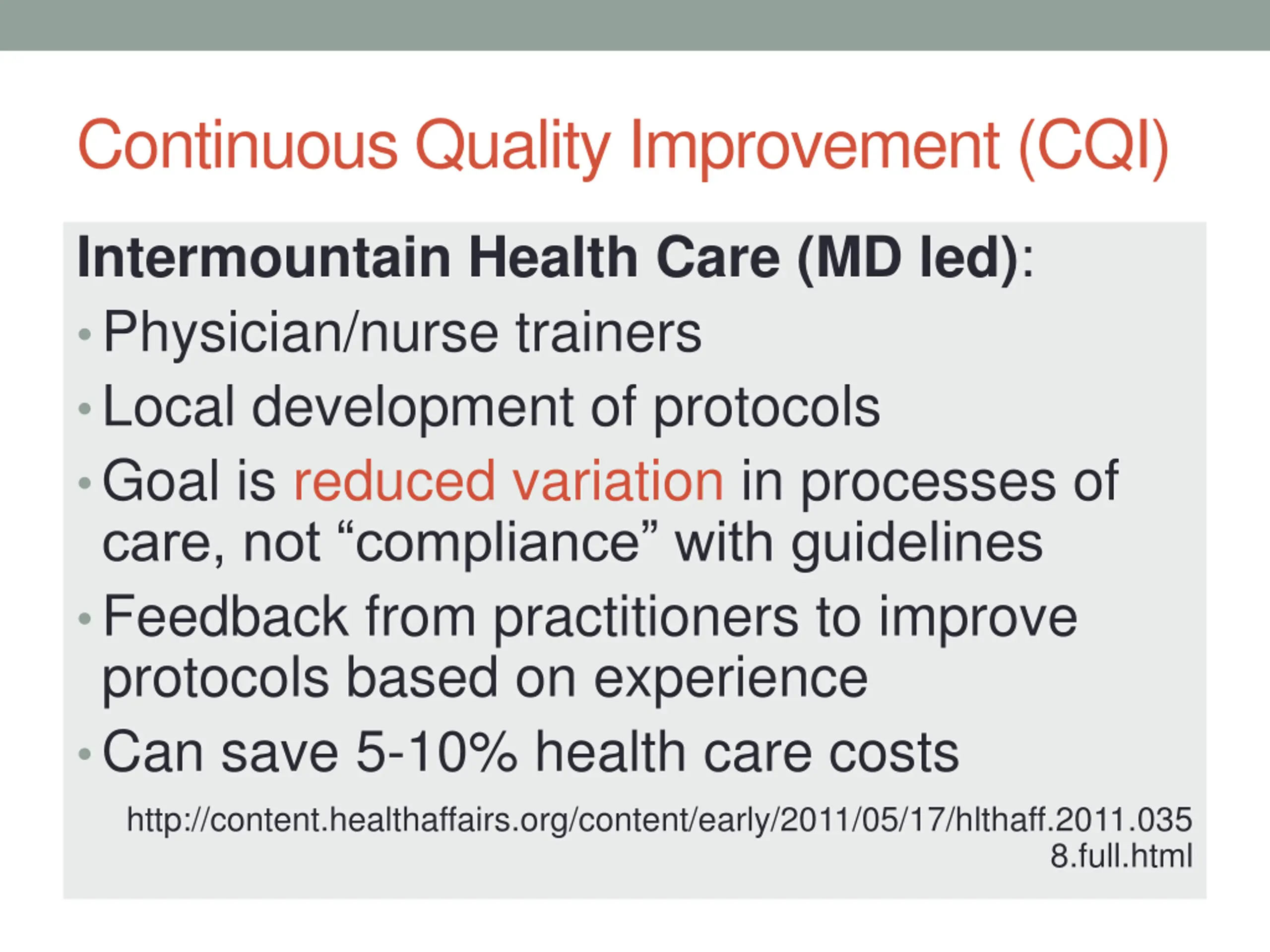 Continuous Quality Improvement (CQI) Intermountain Health Care (MD led): Physician/nurse trainers Local development of protocols Goal is reduced variation in processes of care, not compliance with guidelines Feedback from practitioners to improve protocols based on experience Can save 5-10% health care costs http://content.healthaffairs.org/content/early/2011/05/17/hlthaff.2011.035 8.full.html