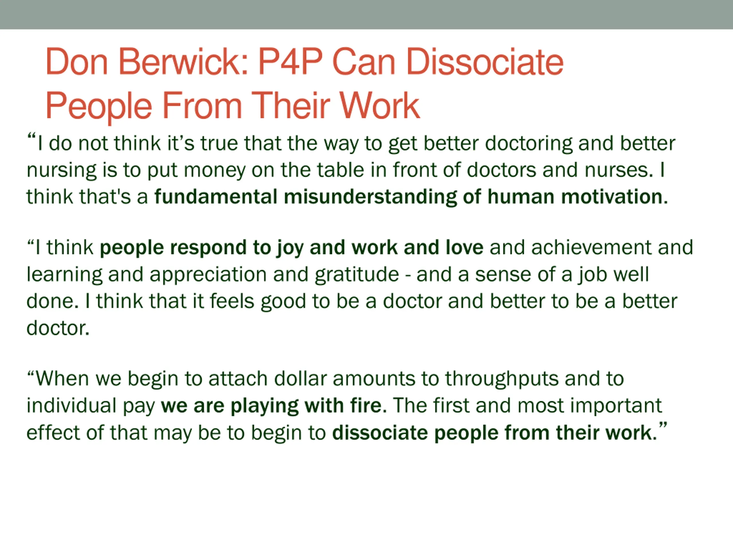 Don Berwick: P4P Can Dissociate People From Their Work I do not think it s true that the way to get better doctoring and better nursing is to put money on the table in front of doctors and nurses. I think that's a fundamental misunderstanding of human motivation. I think people respond to joy and work and love and achievement and learning and appreciation and gratitude - and a sense of a job well done. I think that it feels good to be a doctor and better to be a better doctor. When we begin to attach dollar amounts to throughputs and to individual pay we are playing with fire. The first and most important effect of that may be to begin to dissociate people from their work. Don Berwick, M.D. Health Affairs. 1/12/2005