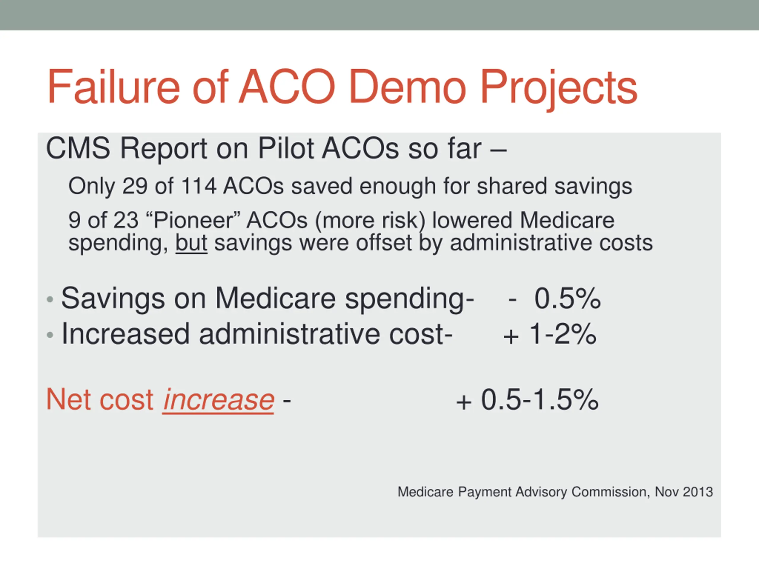 Failure of ACO Demo Projects CMS Report on Pilot ACOs so far Only 29 of 114 ACOs saved enough for shared savings 9 of 23 Pioneer ACOs (more risk) lowered Medicare spending, but savings were offset by administrative costs Savings on Medicare spending- - 0.5% Increased administrative cost- + 1-2% Net cost increase - + 0.5-1.5% Medicare Payment Advisory Commission, Nov 2013