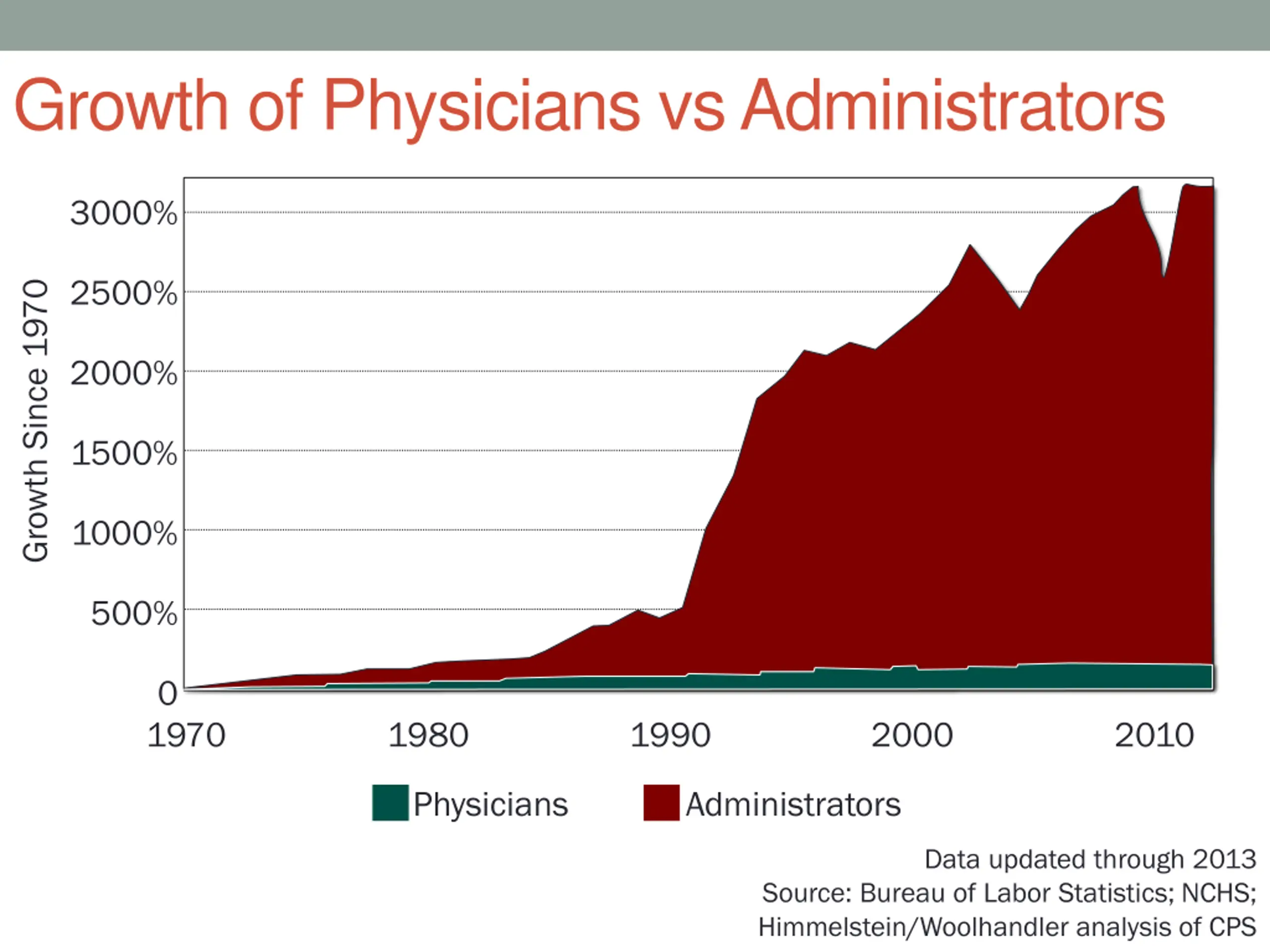 Growth of Physicians vs Administrators 3000% 2500% Growth Since 1970 2000% 1500% 1000% 500% 0 1970 1980 1990 2000 2010 Physicians Administrators Data updated through 2013 Source: Bureau of Labor Statistics; NCHS; Himmelstein/Woolhandler analysis of CPS