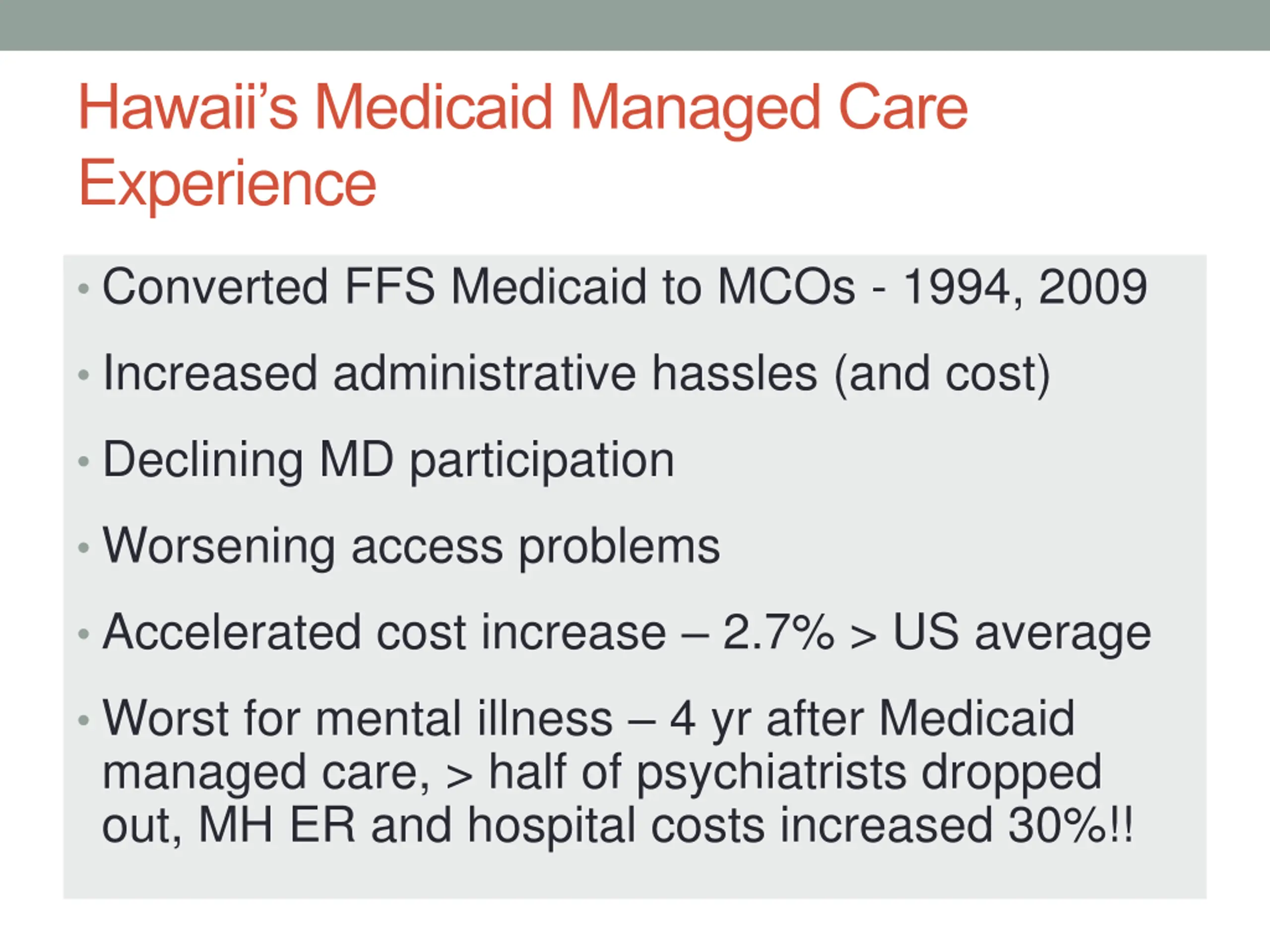 Hawaiis Medicaid Managed Care Experience Converted FFS Medicaid to MCOs - 1994, 2009 Increased administrative hassles (and cost) Declining MD participation Worsening access problems Accelerated cost increase 2.7% > US average Worst for mental illness 4 yr after Medicaid managed care, > half of psychiatrists dropped out, MH ER and hospital costs increased 30%!!