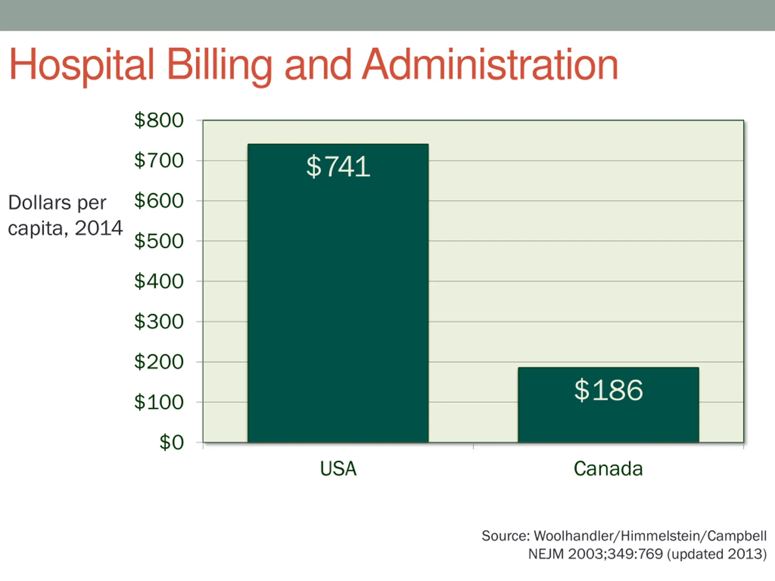 Hospital Billing and Administration $800 $700 $741 $600 Dollars per capita, 2014 $500 $400 $300 $200 $186 $100 $0 USA Canada Source: Woolhandler/Himmelstein/Campbell NEJM 2003;349:769 (updated 2013)