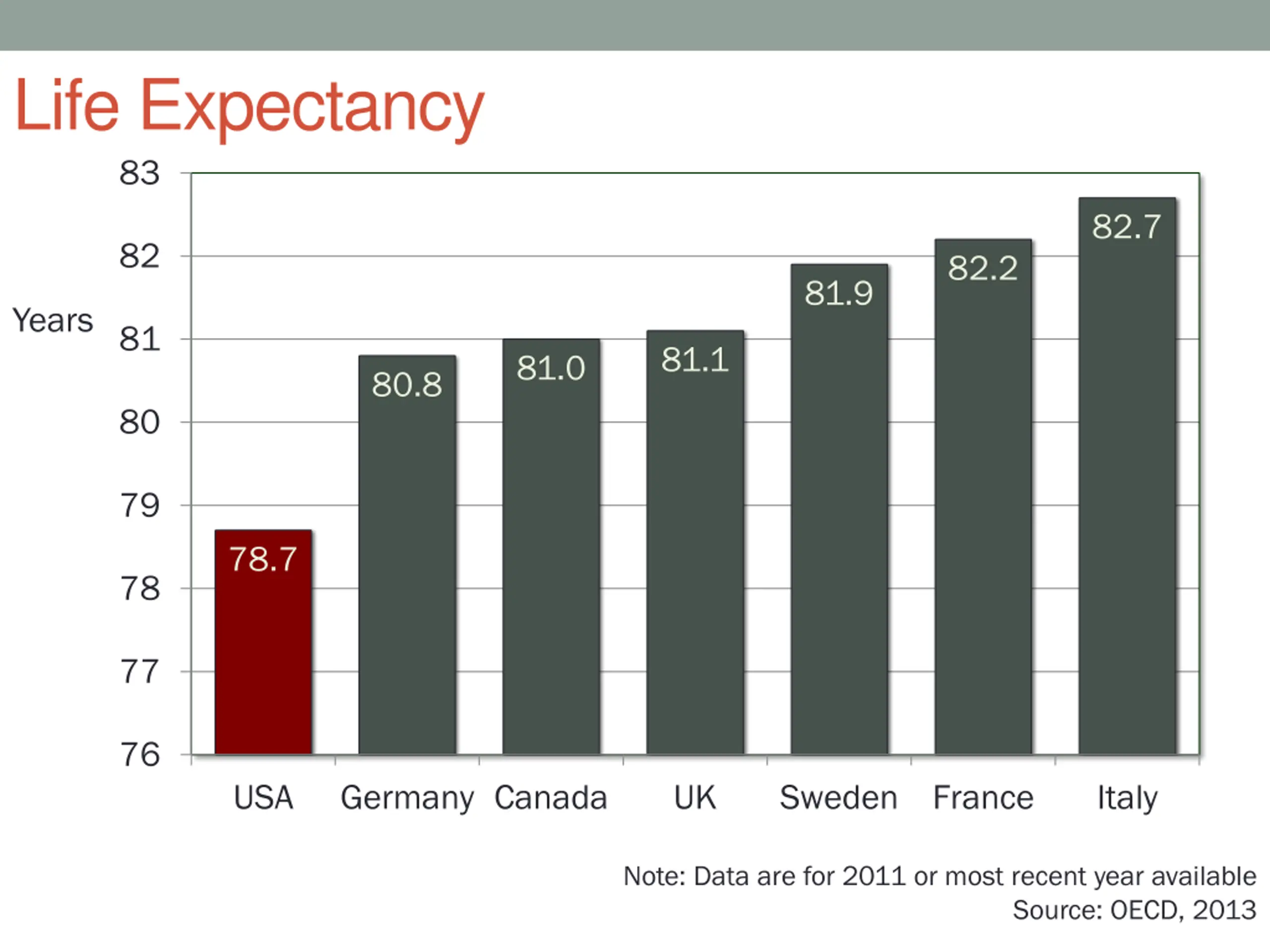 Life Expectancy 83 82.7 82 82.2 81.9 Years 81 81.1 81.0 80.8 80 79 78.7 78 77 76 USA Germany Canada UK Sweden France Italy Note: Data are for 2011 or most recent year available Source: OECD, 2013