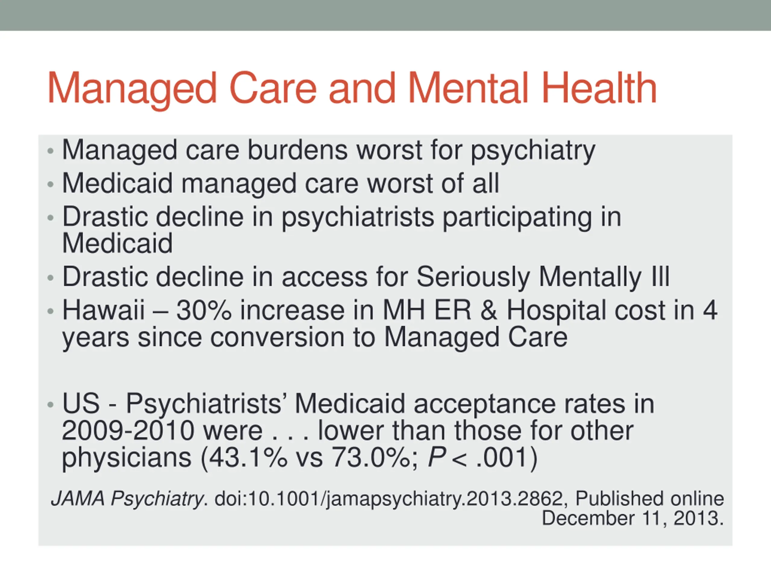 Managed Care and Mental Health Managed care burdens worst for psychiatry Medicaid managed care worst of all Drastic decline in psychiatrists participating in Medicaid Drastic decline in access for Seriously Mentally Ill Hawaii 30% increase in MH ER & Hospital cost in 4 years since conversion to Managed Care US - Psychiatrists Medicaid acceptance rates in 2009-2010 were . . . lower than those for other physicians (43.1% vs 73.0%; P < .001) JAMA Psychiatry. doi:10.1001/jamapsychiatry.2013.2862, Published online December 11, 2013.