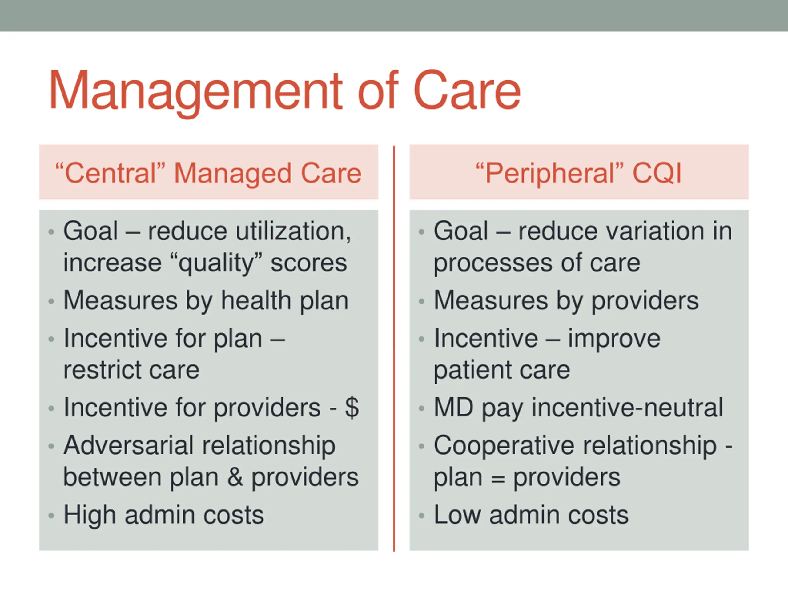 Management of Care Central Managed Care Peripheral CQI Goal reduce utilization, increase quality scores Measures by health plan Incentive for plan restrict care Incentive for providers - $ Adversarial relationship between plan & providers High admin costs Goal reduce variation in processes of care Measures by providers Incentive improve patient care MD pay incentive-neutral Cooperative relationship - plan = providers Low admin costs