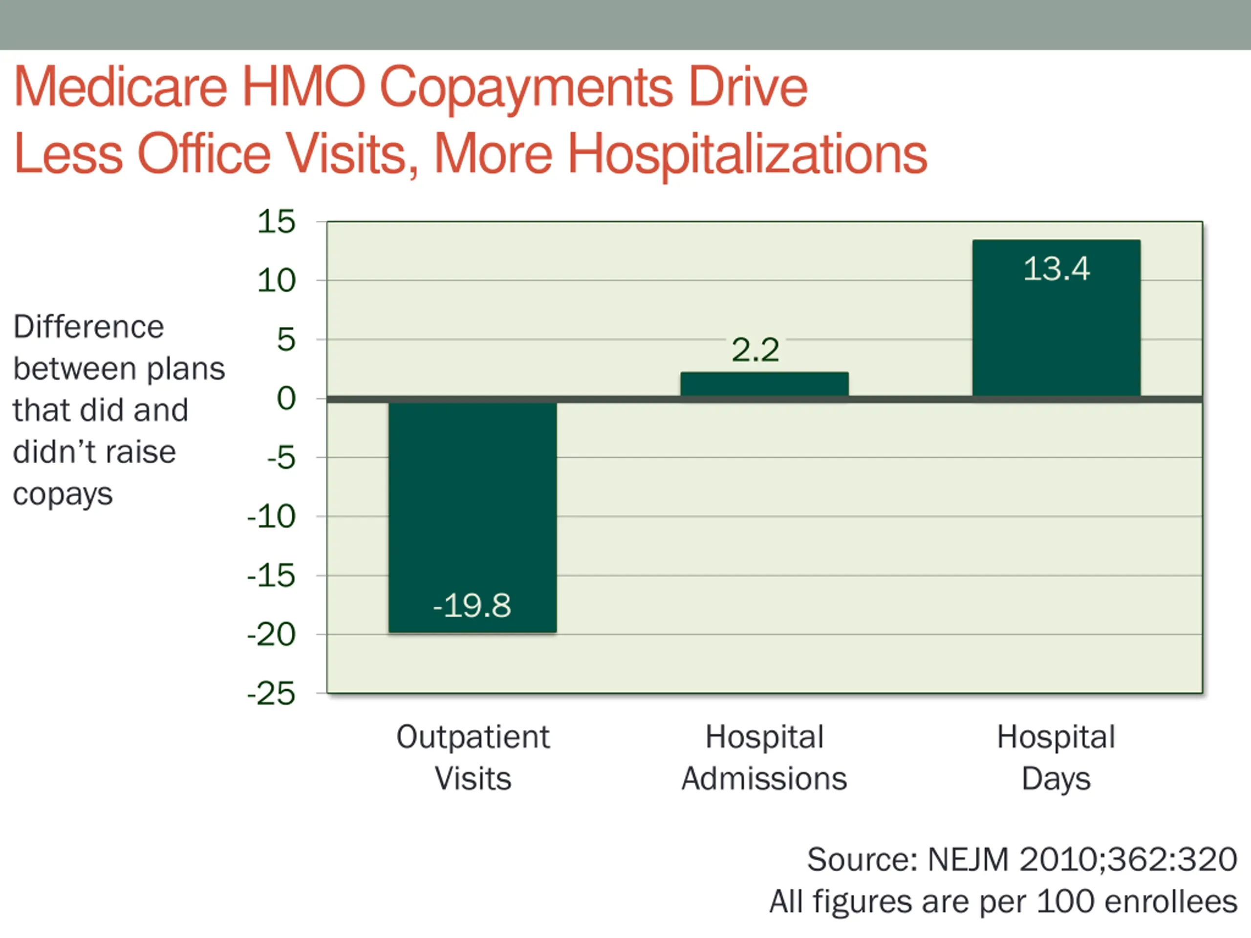 Medicare HMO Copayments Drive Less Office Visits, More Hospitalizations 15 13.4 10 Difference between plans that did and didn t raise copays 5 2.2 0 -5 -10 -15 -19.8 -20 -25 Outpatient Visits Hospital Admissions Hospital Days Source: NEJM 2010;362:320 All figures are per 100 enrollees