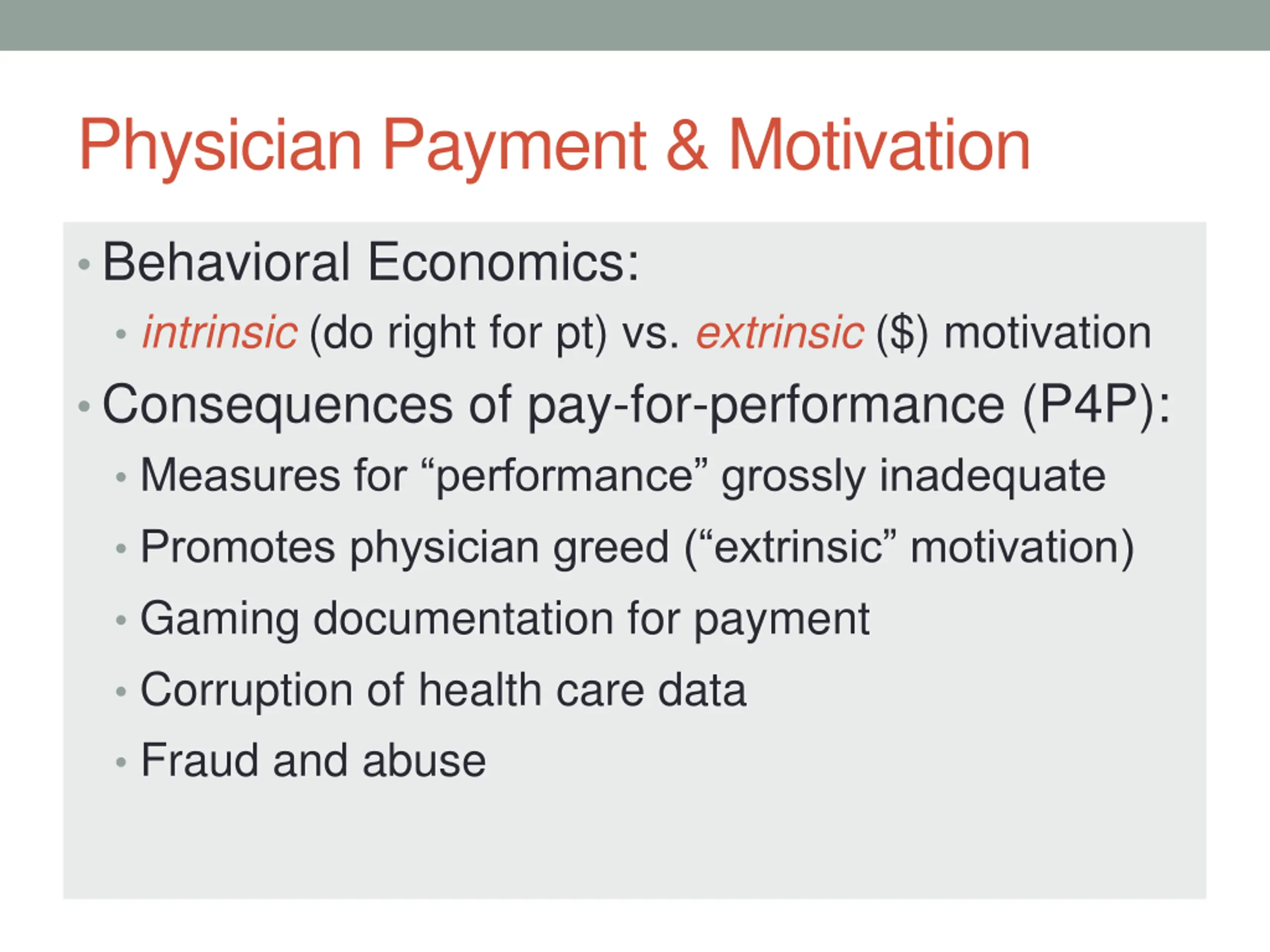 Physician Payment & Motivation Behavioral Economics: intrinsic (do right for pt) vs. extrinsic ($) motivation Consequences of pay-for-performance (P4P): Measures for performance grossly inadequate Promotes physician greed ( extrinsic motivation) Gaming documentation for payment Corruption of health care data Fraud and abuse