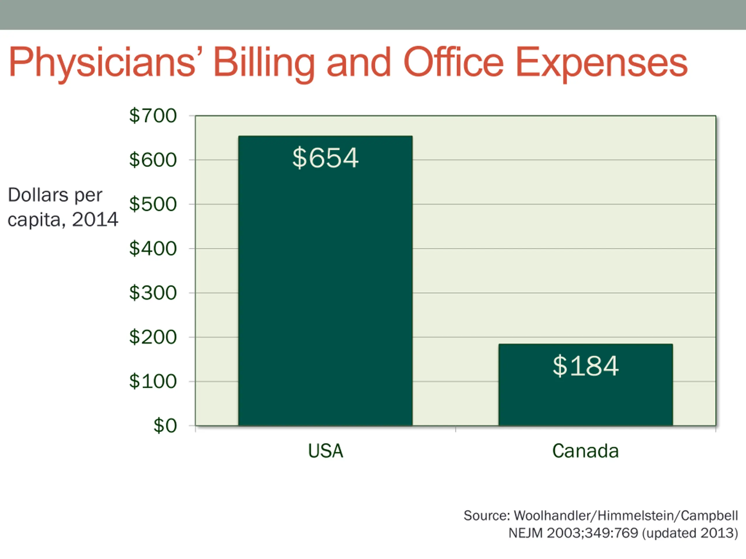 Physicians Billing and Office Expenses $700 $654 $600 Dollars per capita, 2014 $500 $400 $300 $200 $184 $100 $0 USA Canada Source: Woolhandler/Himmelstein/Campbell NEJM 2003;349:769 (updated 2013)