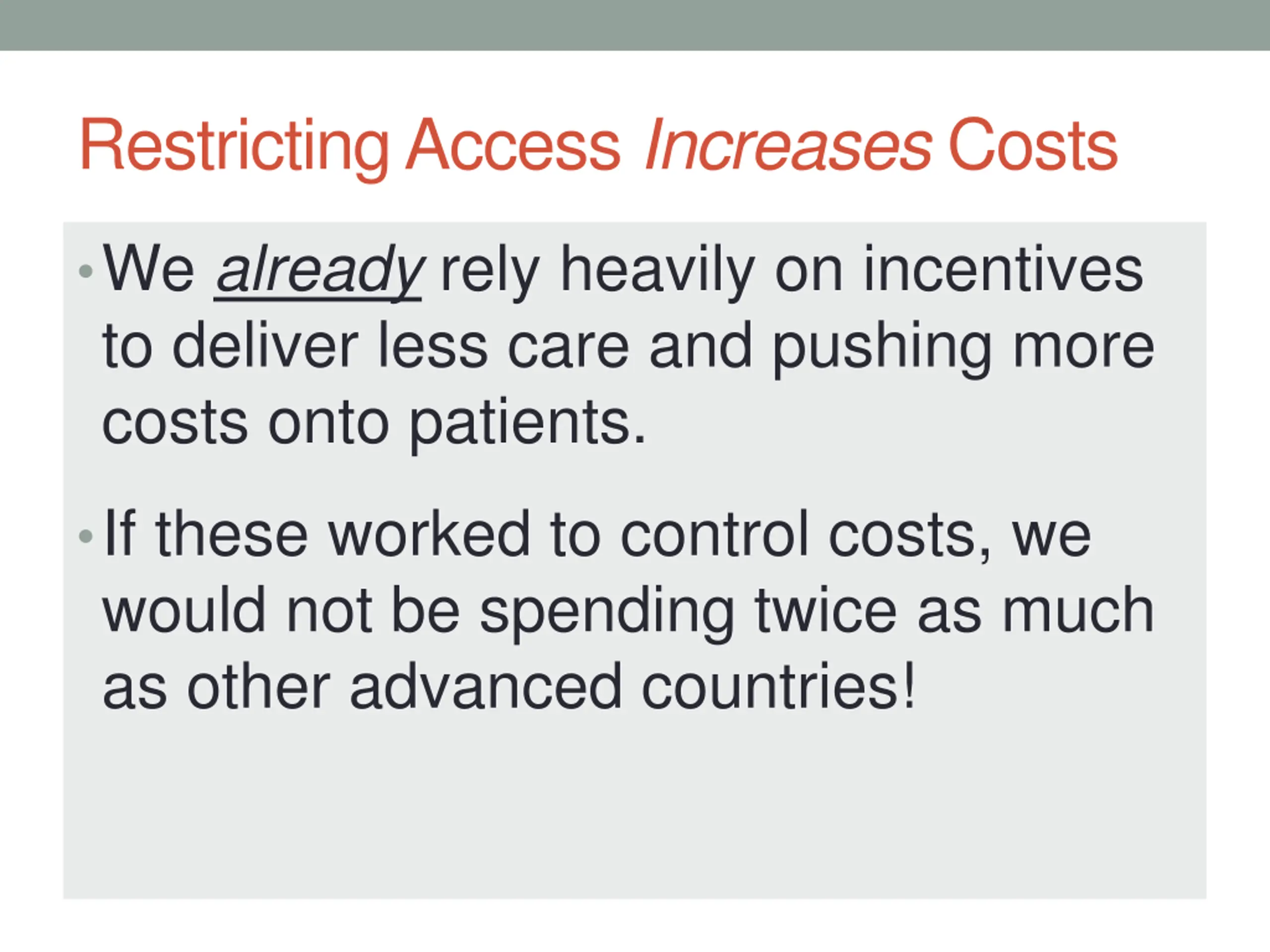 Restricting Access Increases Costs We already rely heavily on incentives to deliver less care and pushing more costs onto patients. If these worked to control costs, we would not be spending twice as much as other advanced countries!