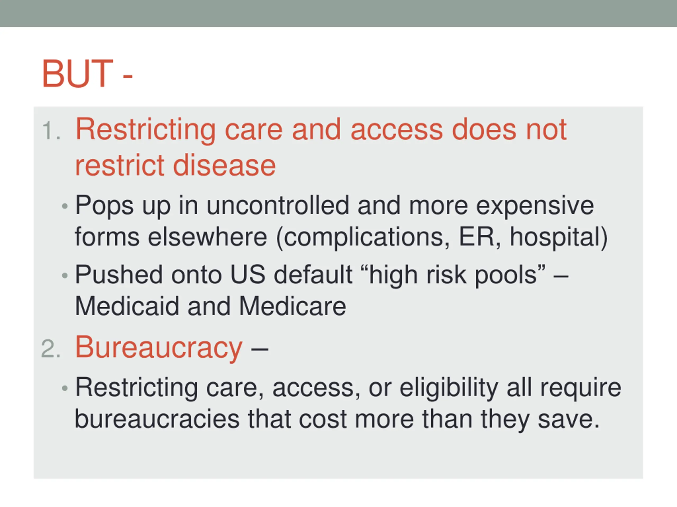 BUT - 1. Restricting care and access does not restrict disease Pops up in uncontrolled and more expensive forms elsewhere (complications, ER, hospital) Pushed onto US default high risk pools Medicaid and Medicare 2. Bureaucracy Restricting care, access, or eligibility all require bureaucracies that cost more than they save.