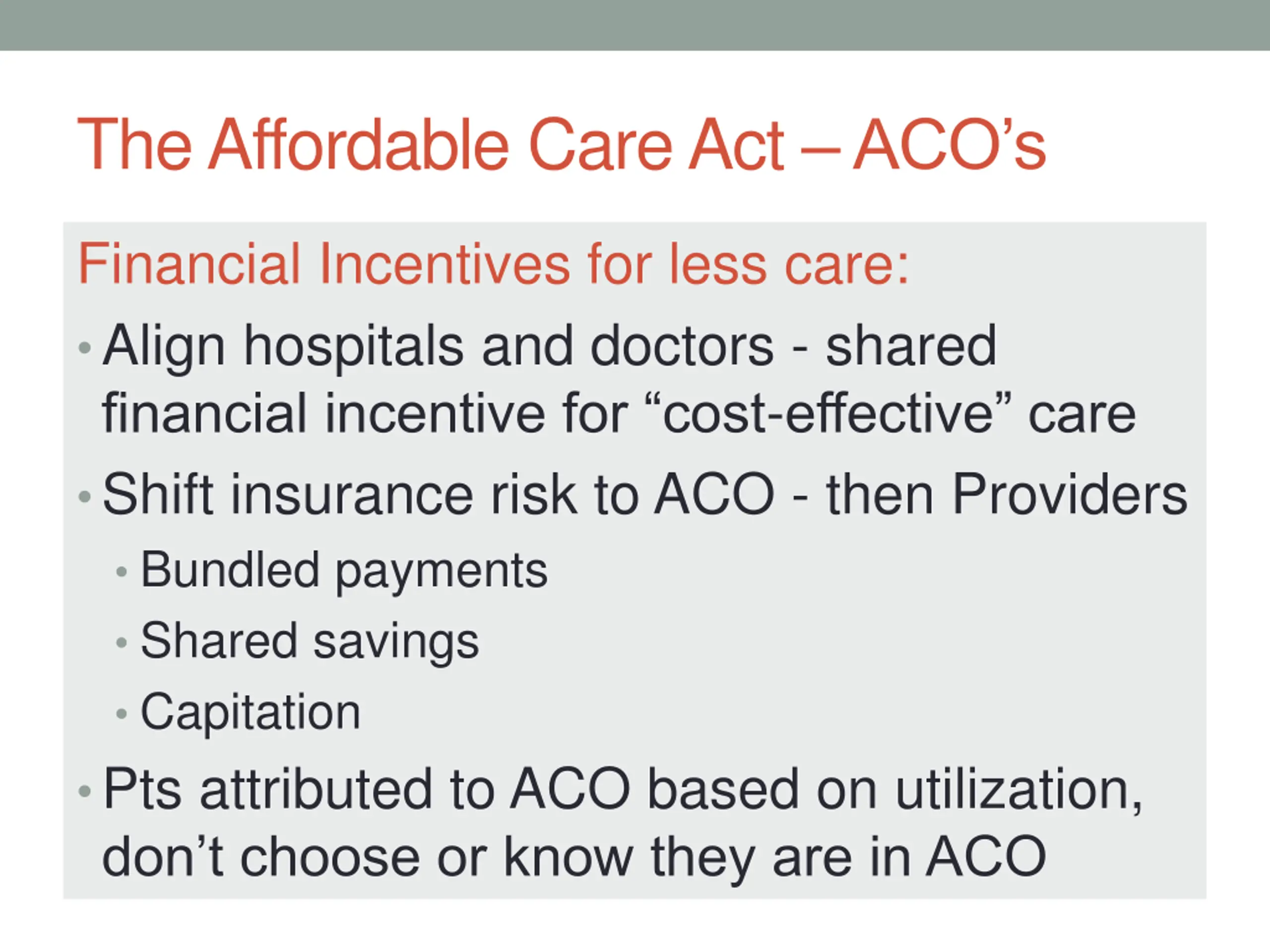 The Affordable Care Act ACOs Financial Incentives for less care: Align hospitals and doctors - shared financial incentive for cost-effective care Shift insurance risk to ACO - then Providers Bundled payments Shared savings Capitation Pts attributed to ACO based on utilization, don t choose or know they are in ACO