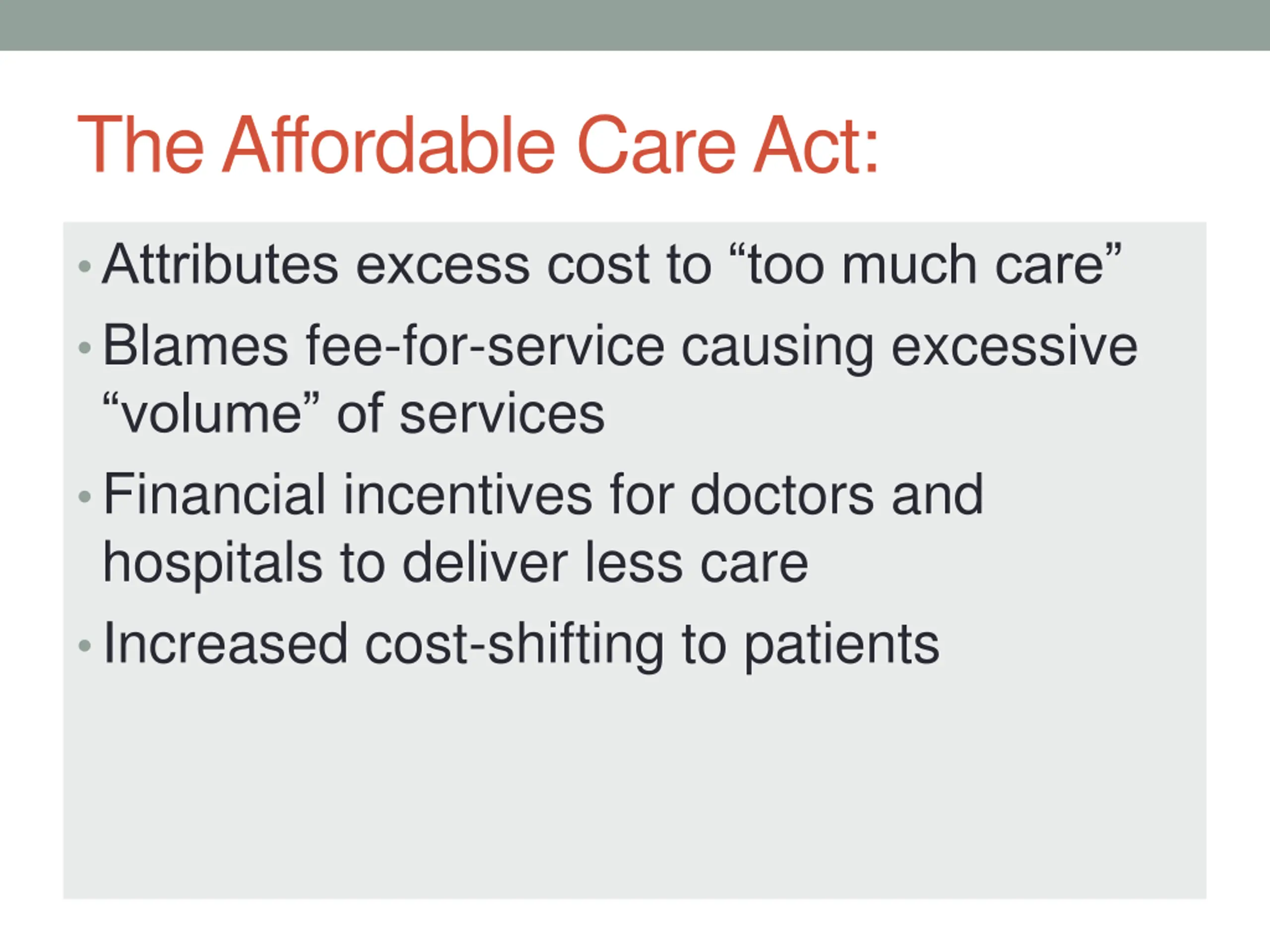 The Affordable Care Act: Attributes excess cost to too much care Blames fee-for-service causing excessive volume of services Financial incentives for doctors and hospitals to deliver less care Increased cost-shifting to patients