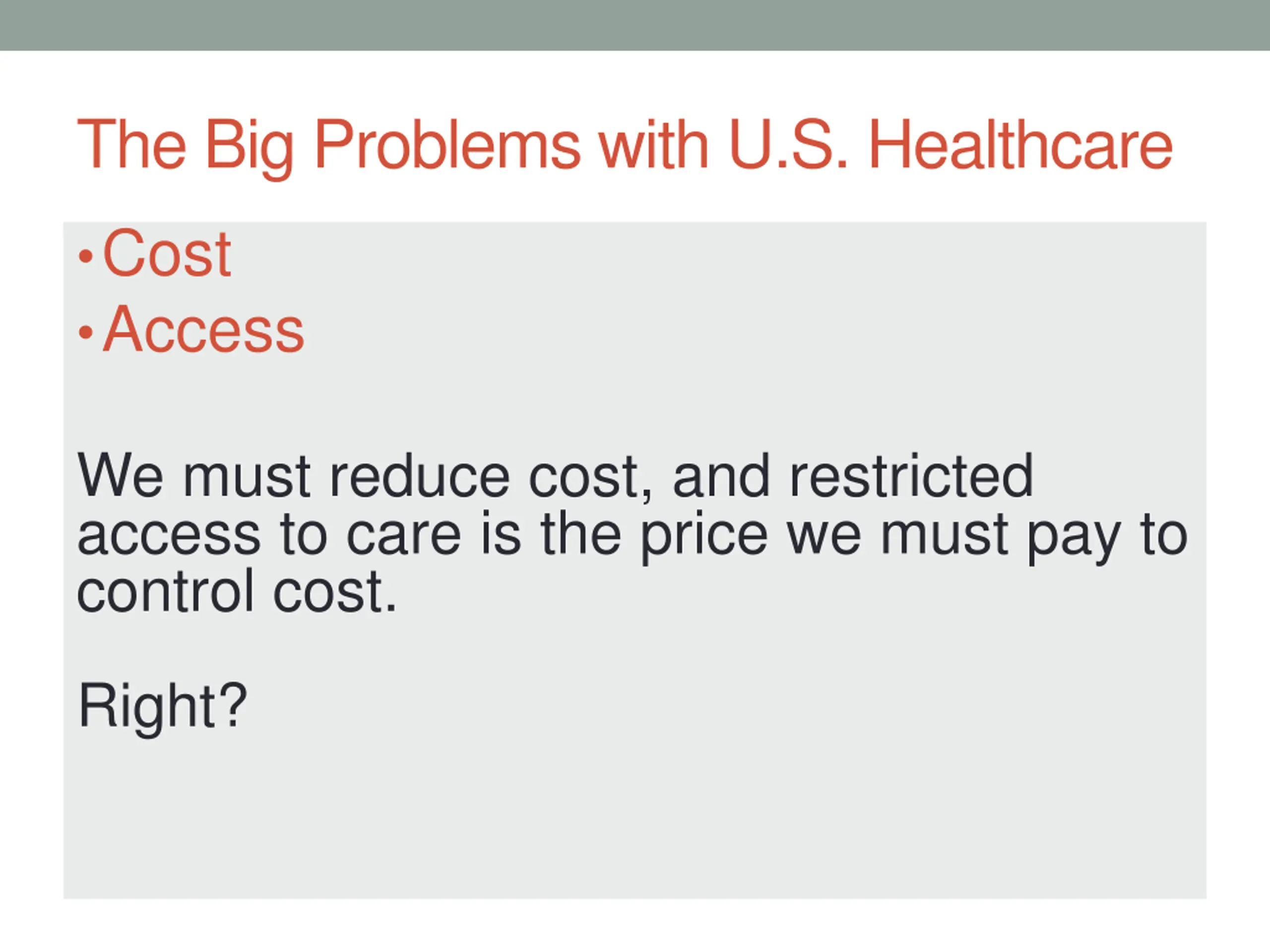 The Big Problems with U.S. Healthcare Cost Access We must reduce cost, and restricted access to care is the price we must pay to control cost. Right?