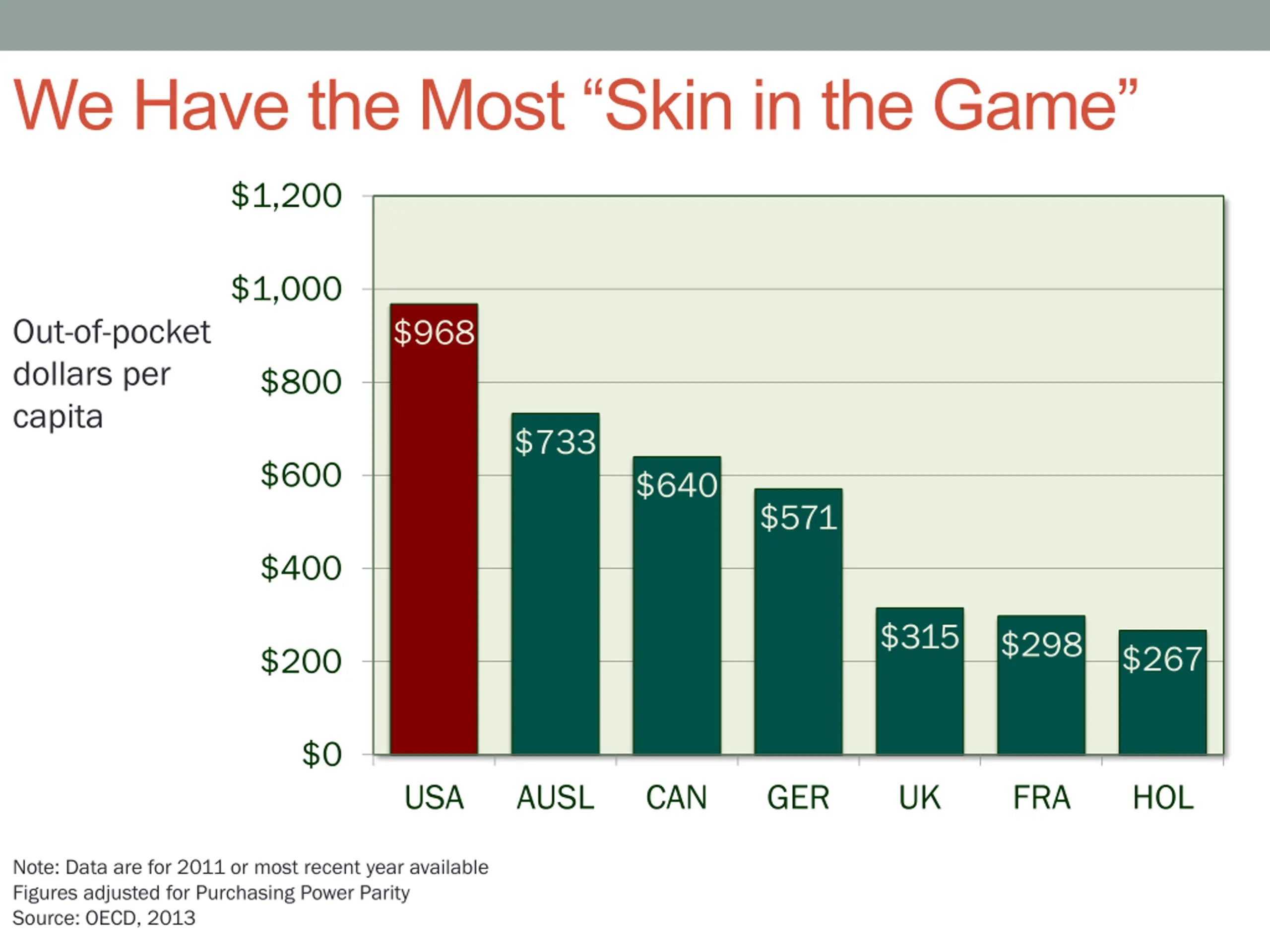 We Have the Most Skin in the Game $1,200 $1,000 Out-of-pocket dollars per capita $968 $800 $733 $600 $640 $571 $400 $315 $298 $267 $200 $0 USA AUSL CAN GER UK FRA HOL Note: Data are for 2011 or most recent year available Figures adjusted for Purchasing Power Parity Source: OECD, 2013
