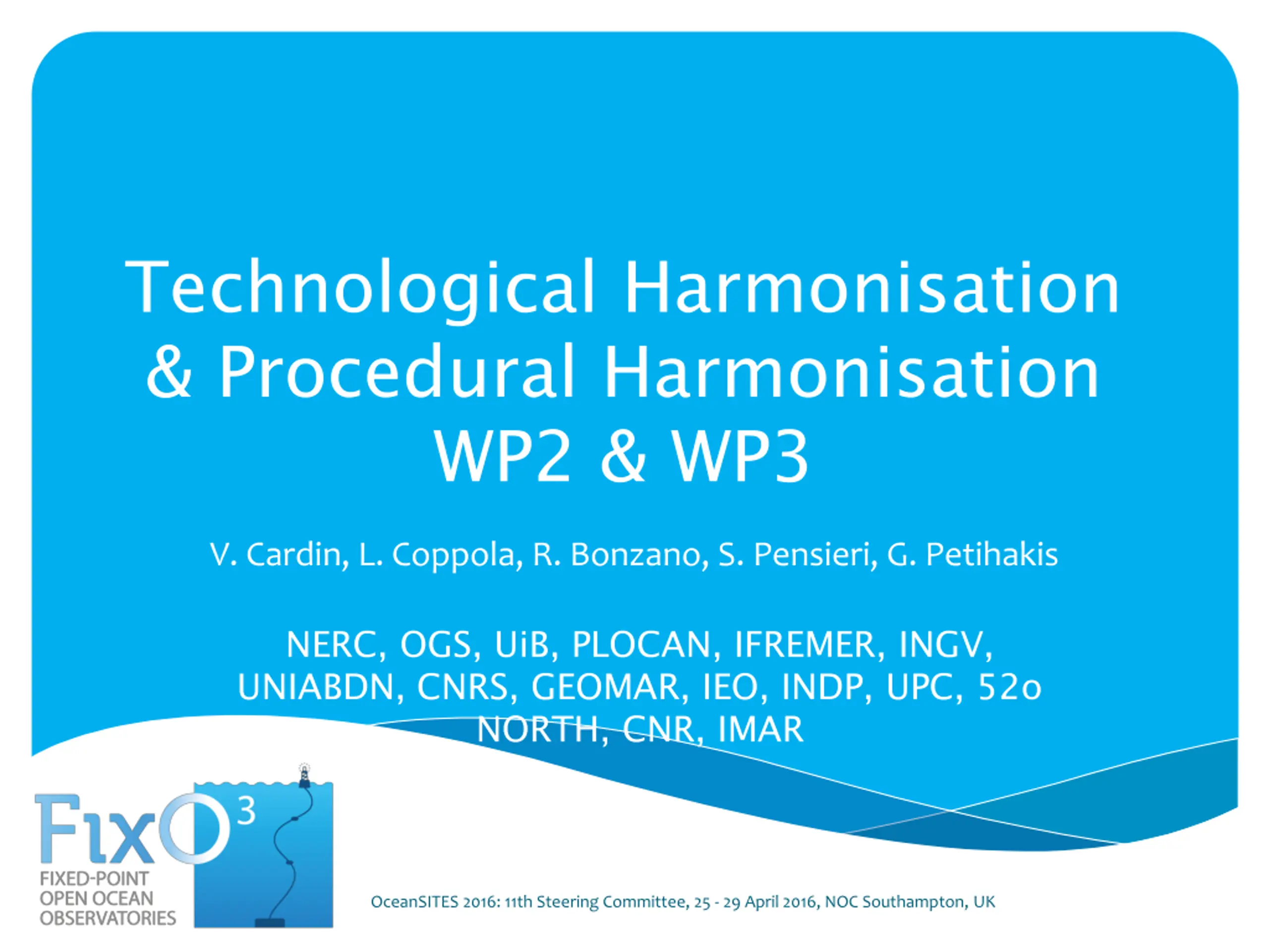 Technological Harmonisation & Procedural Harmonisation WP2 & WP3 V. Cardin, L. Coppola, R. Bonzano, S. Pensieri, G. Petihakis NERC, OGS, UiB, PLOCAN, IFREMER, INGV, UNIABDN, CNRS, GEOMAR, IEO, INDP, UPC, 52o NORTH, CNR, IMAR OceanSITES 2016: 11th Steering Committee, 25 - 29 April 2016, NOC Southampton, UK