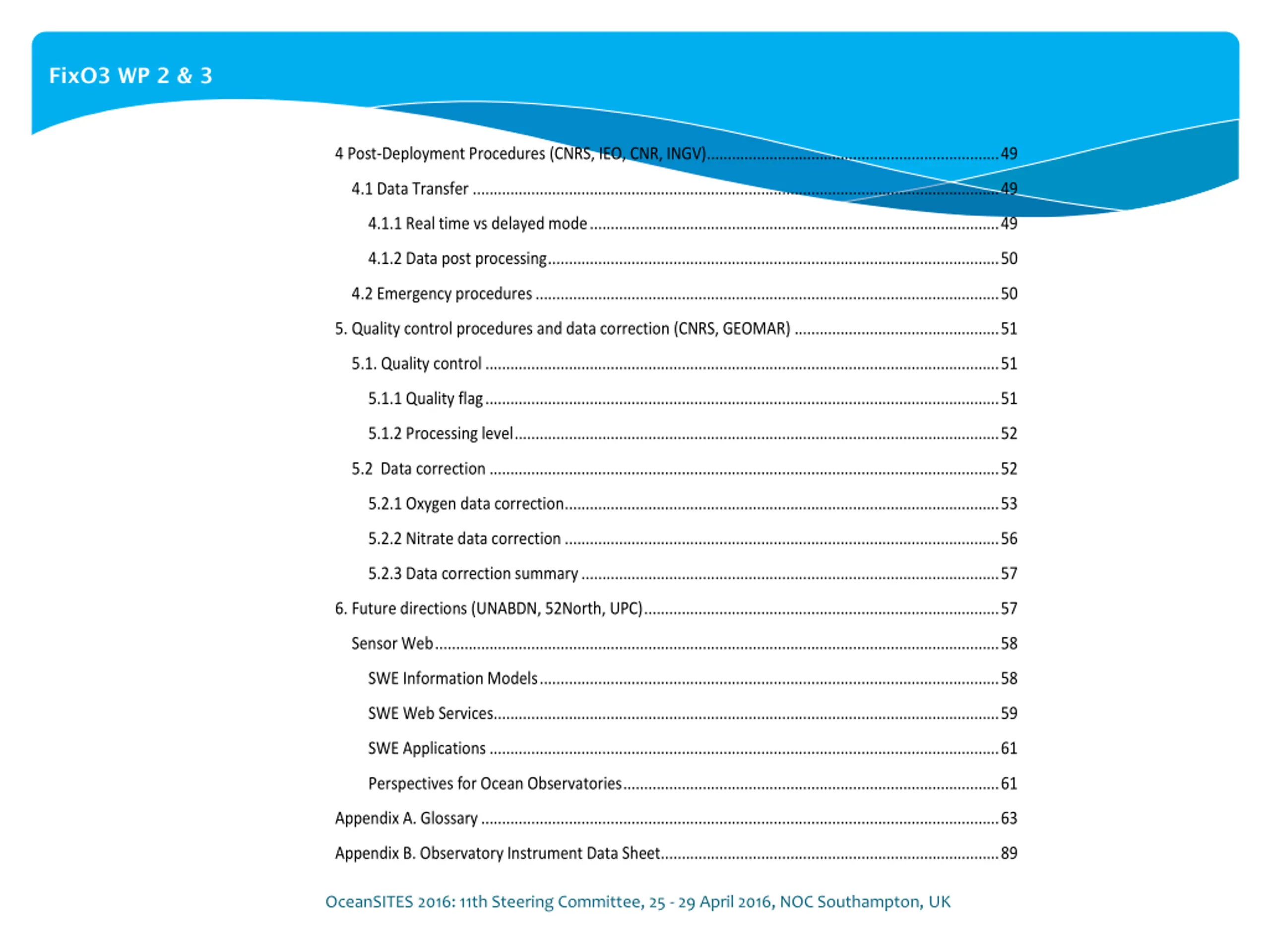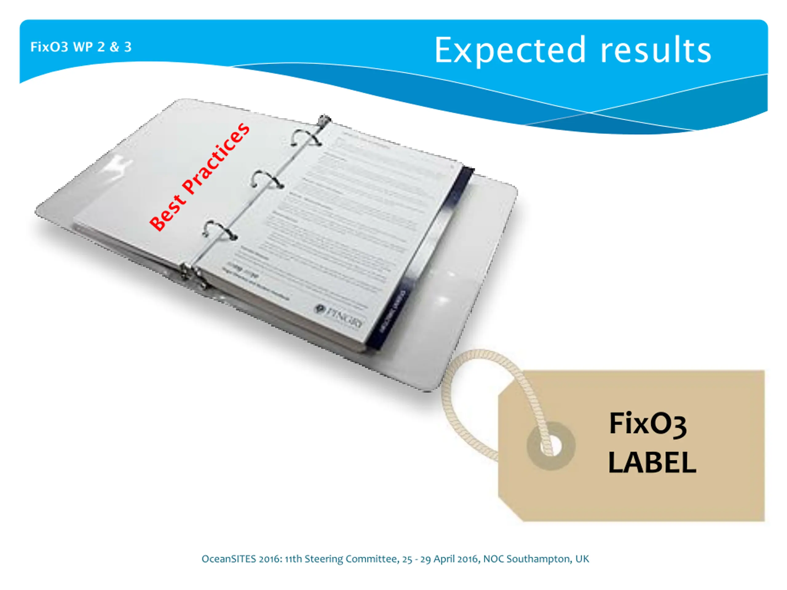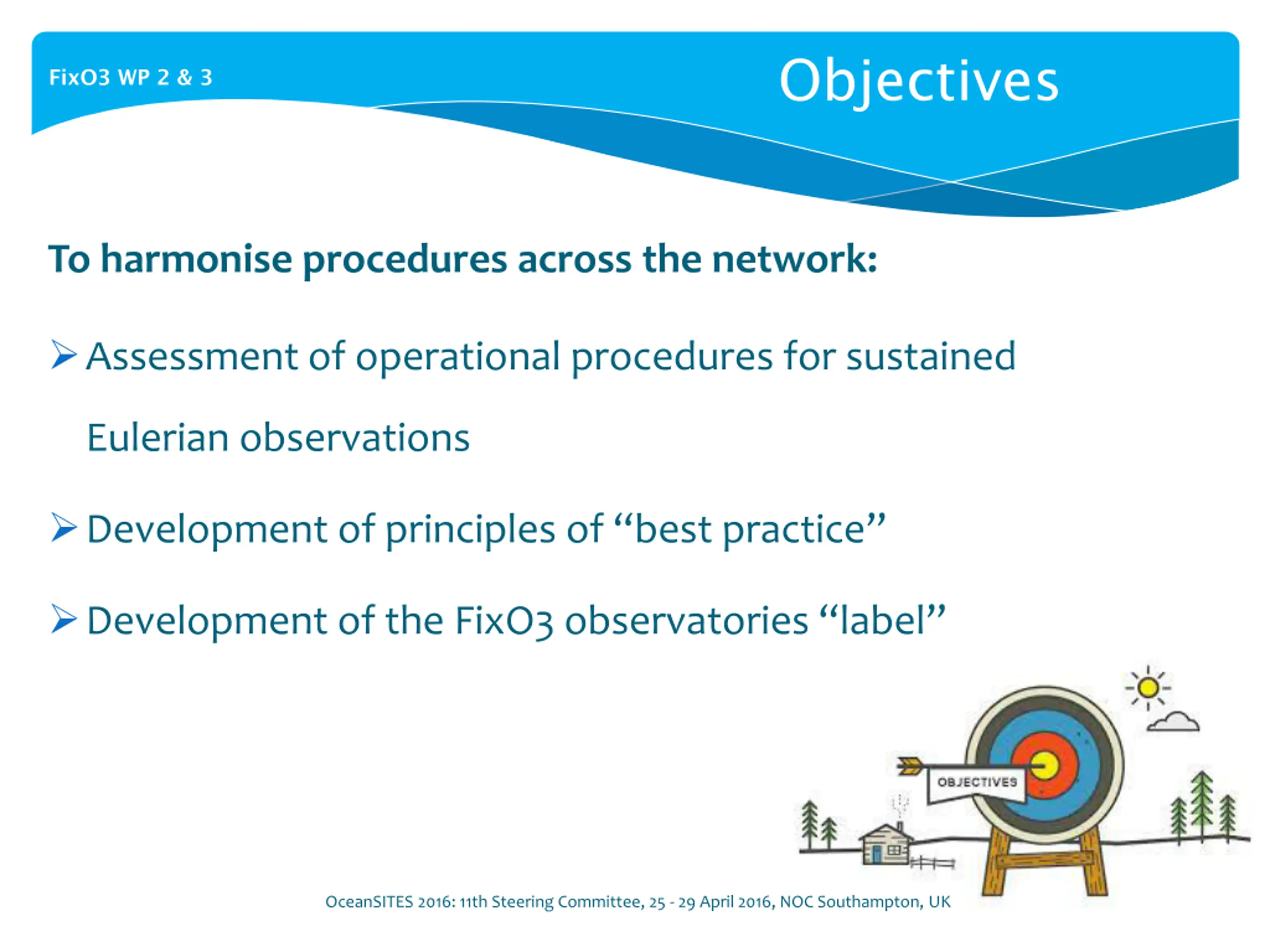 Objectives FixO3 WP 2 & 3 To harmonise procedures across the network: Assessment of operational procedures for sustained Eulerian observations Development of principles of best practice Development of the FixO3 observatories label OceanSITES 2016: 11th Steering Committee, 25 - 29 April 2016, NOC Southampton, UK
