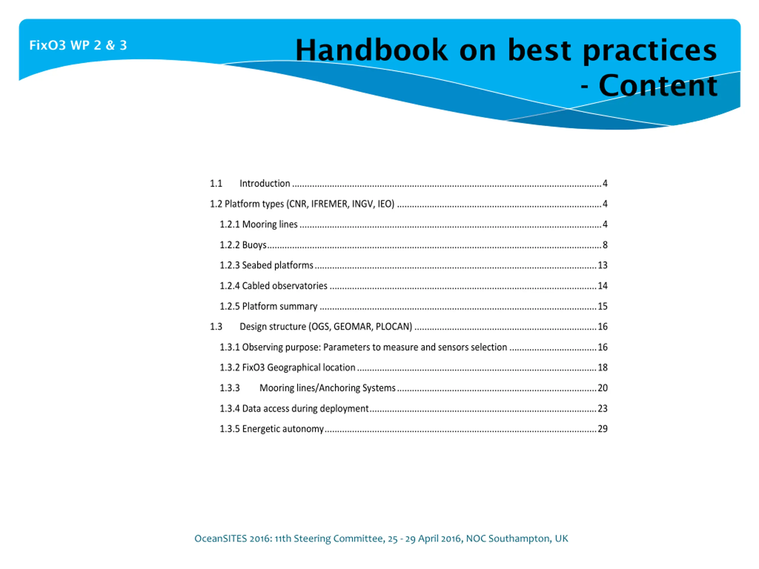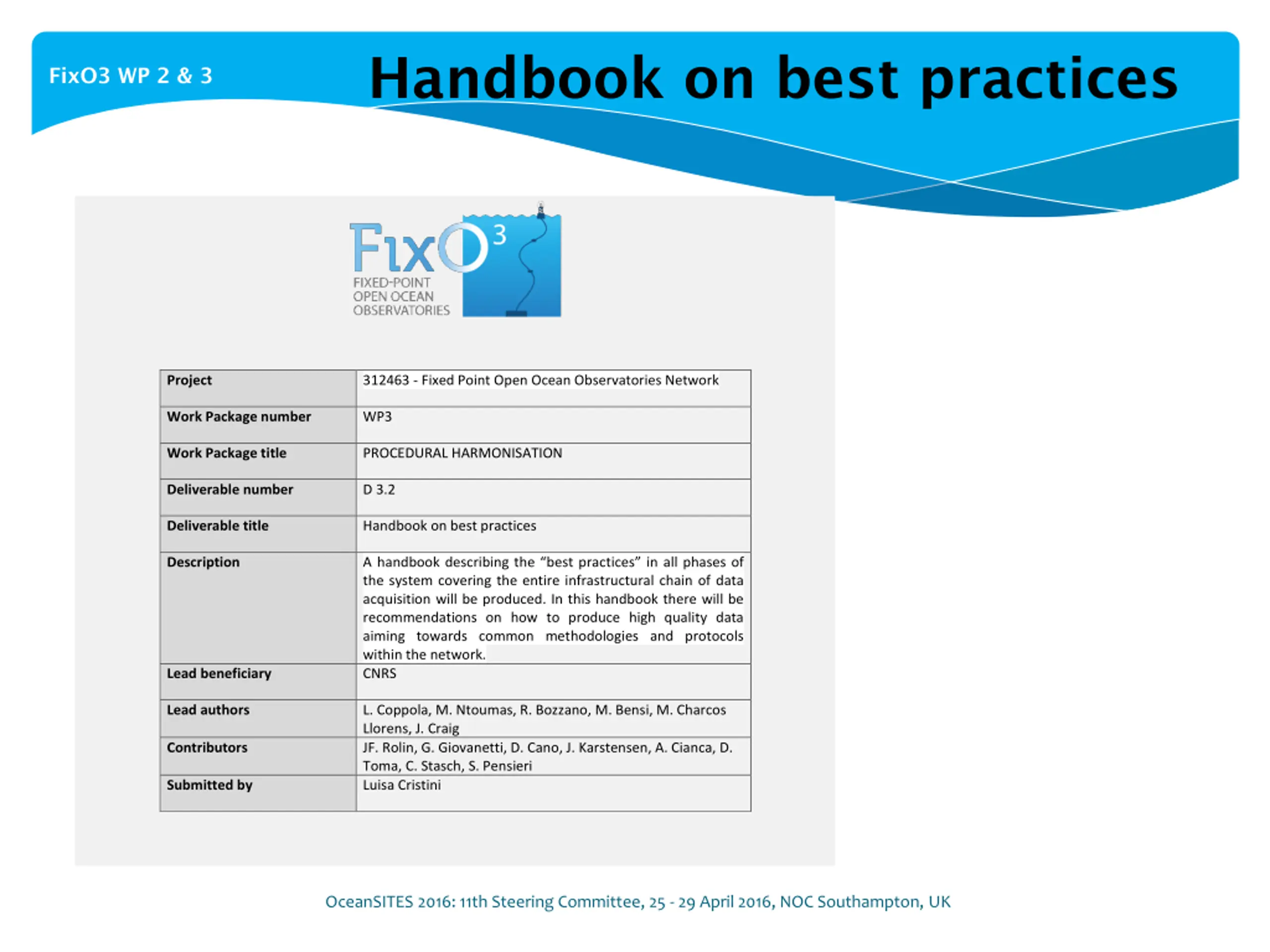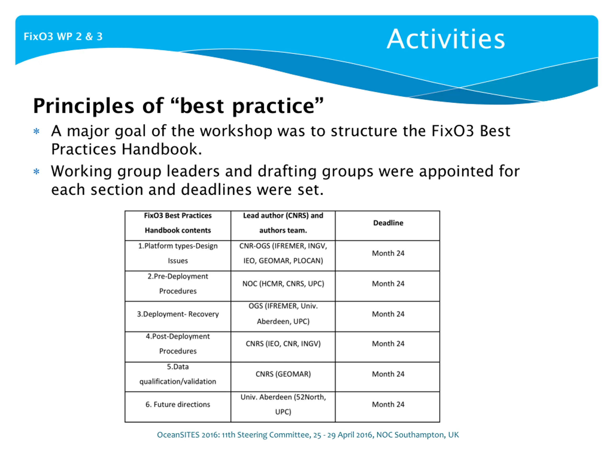 Activities FixO3 WP 2 & 3 Principles of best practice A major goal of the workshop was to structure the FixO3 Best Practices Handbook. Working group leaders and drafting groups were appointed for each section and deadlines were set. OceanSITES 2016: 11th Steering Committee, 25 - 29 April 2016, NOC Southampton, UK