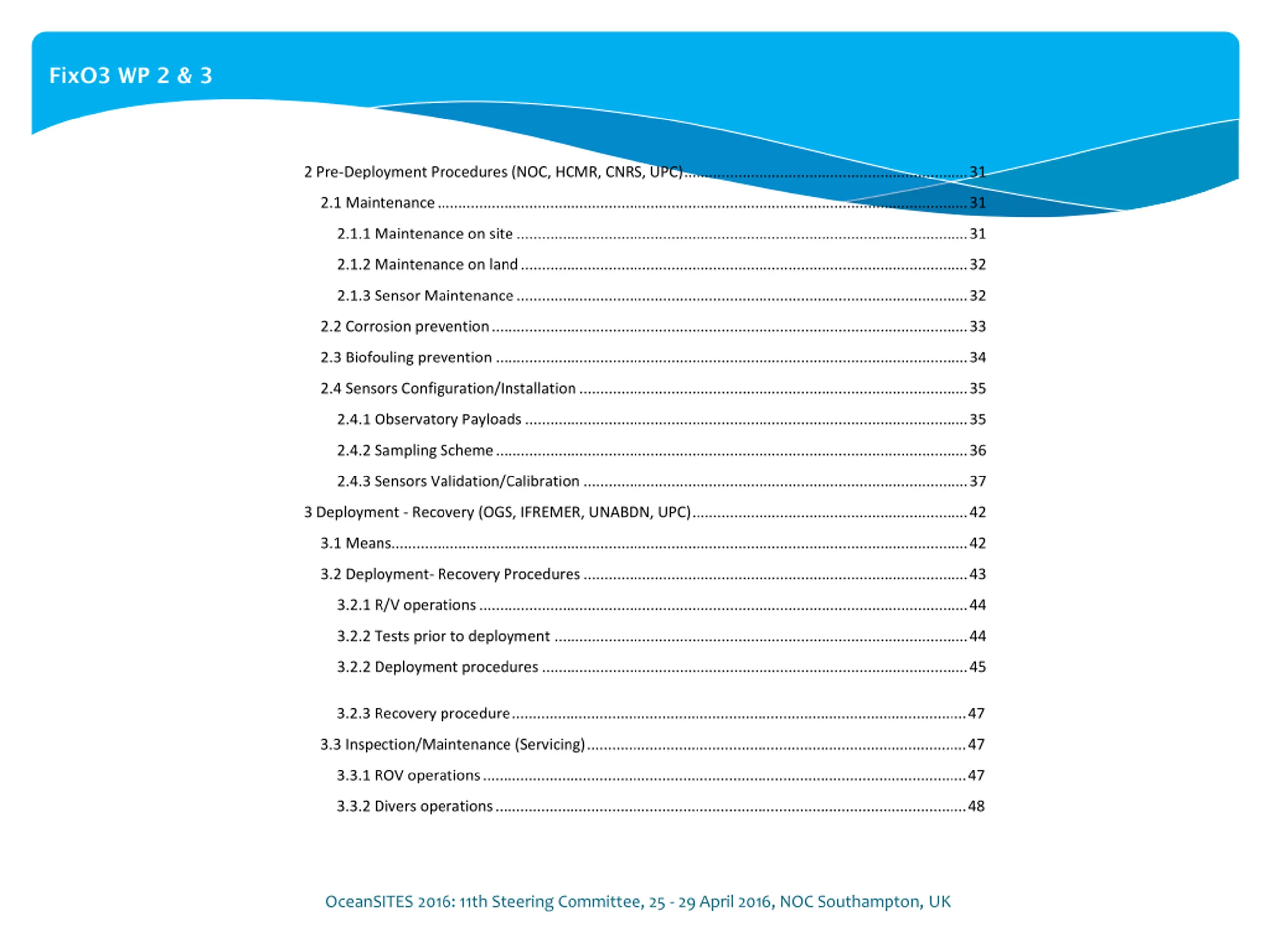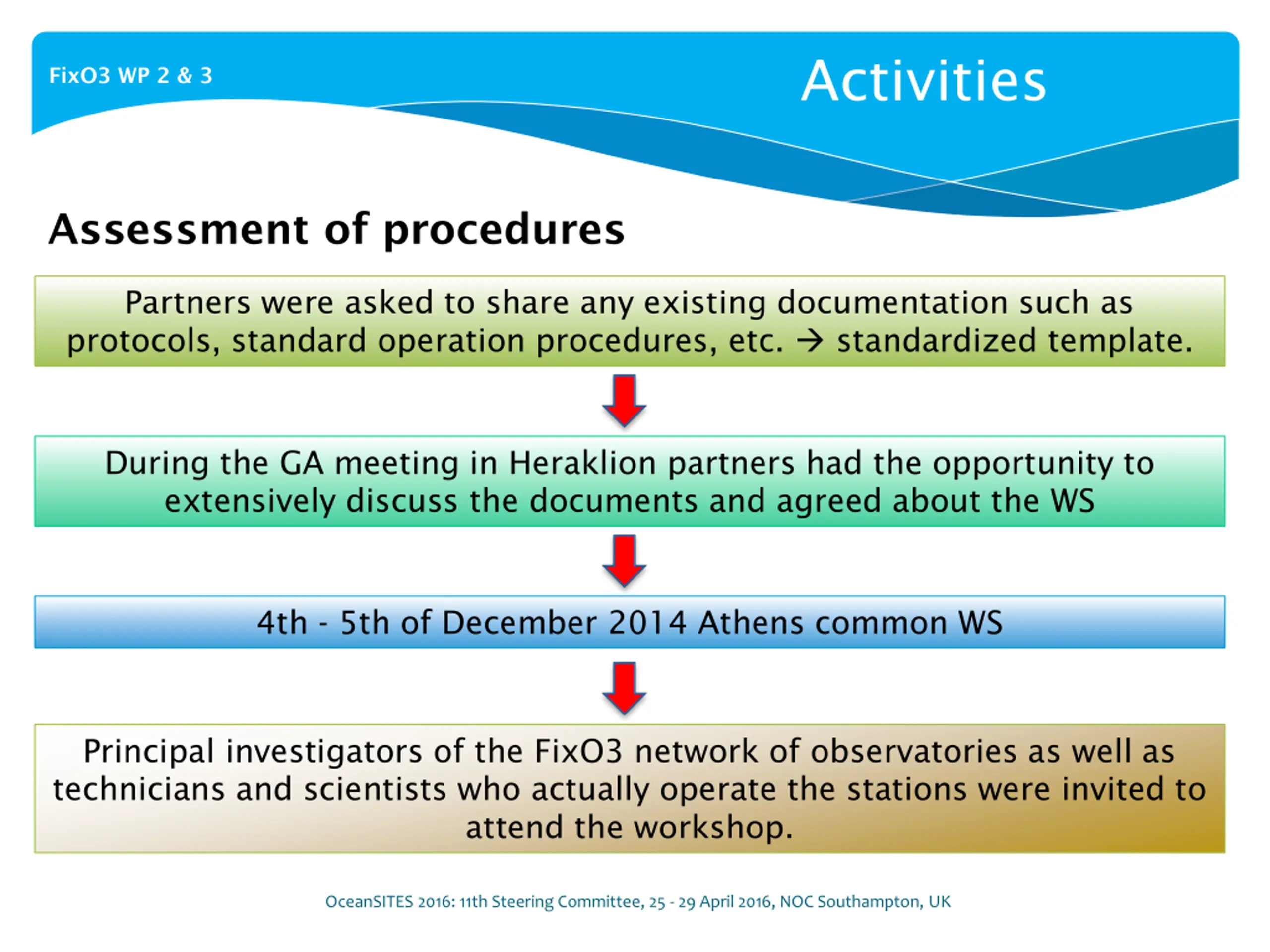 Activities FixO3 WP 2 & 3 Assessment of procedures Partners were asked to share any existing documentation such as protocols, standard operation procedures, etc. standardized template. During the GA meeting in Heraklion partners had the opportunity to extensively discuss the documents and agreed about the WS 4th - 5th of December 2014 Athens common WS Principal investigators of the FixO3 network of observatories as well as technicians and scientists who actually operate the stations were invited to attend the workshop. OceanSITES 2016: 11th Steering Committee, 25 - 29 April 2016, NOC Southampton, UK