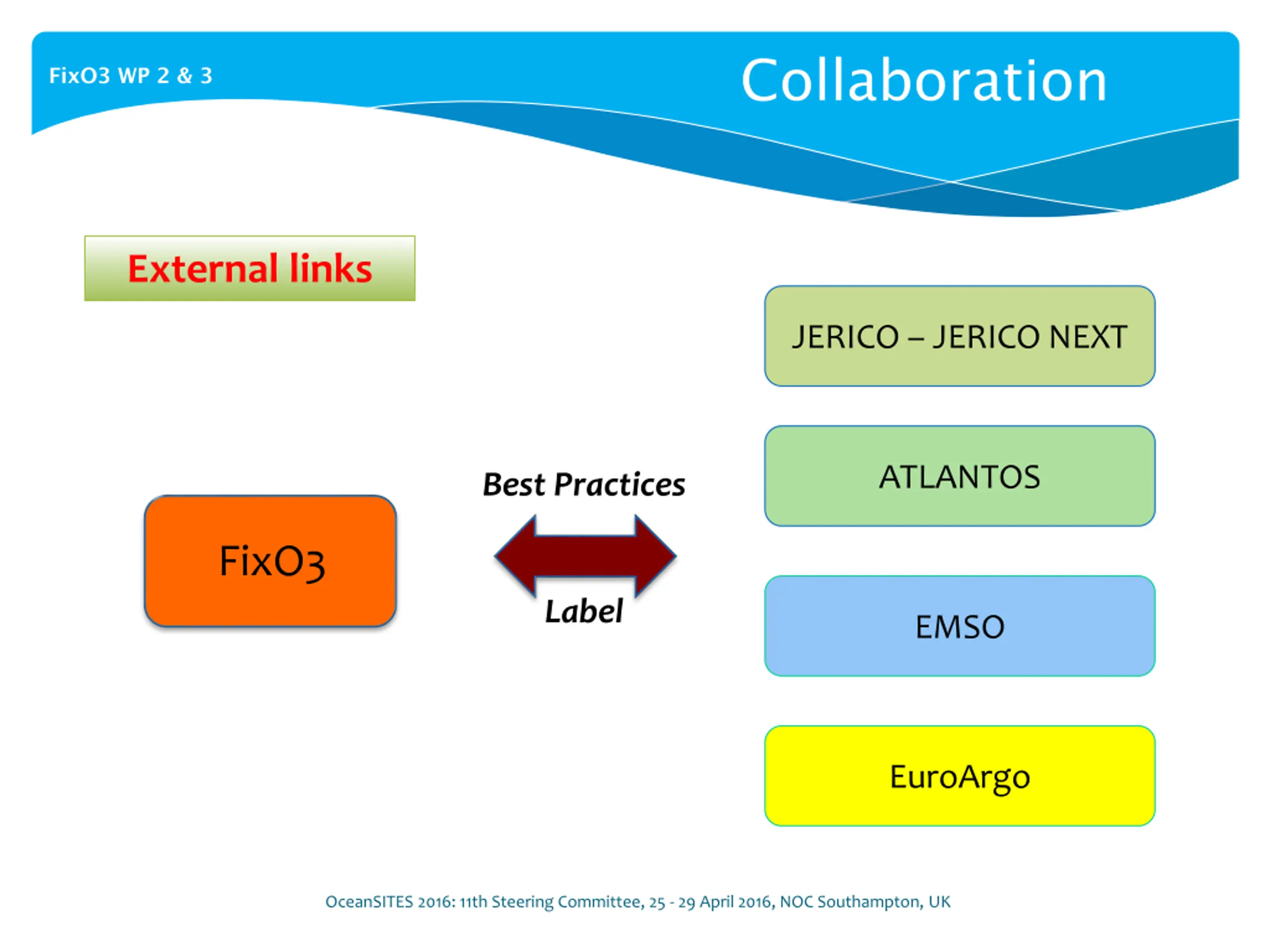 Collaboration FixO3 WP 2 & 3 External links JERICO JERICO NEXT ATLANTOS Best Practices FixO3 Label EMSO EuroArgo OceanSITES 2016: 11th Steering Committee, 25 - 29 April 2016, NOC Southampton, UK