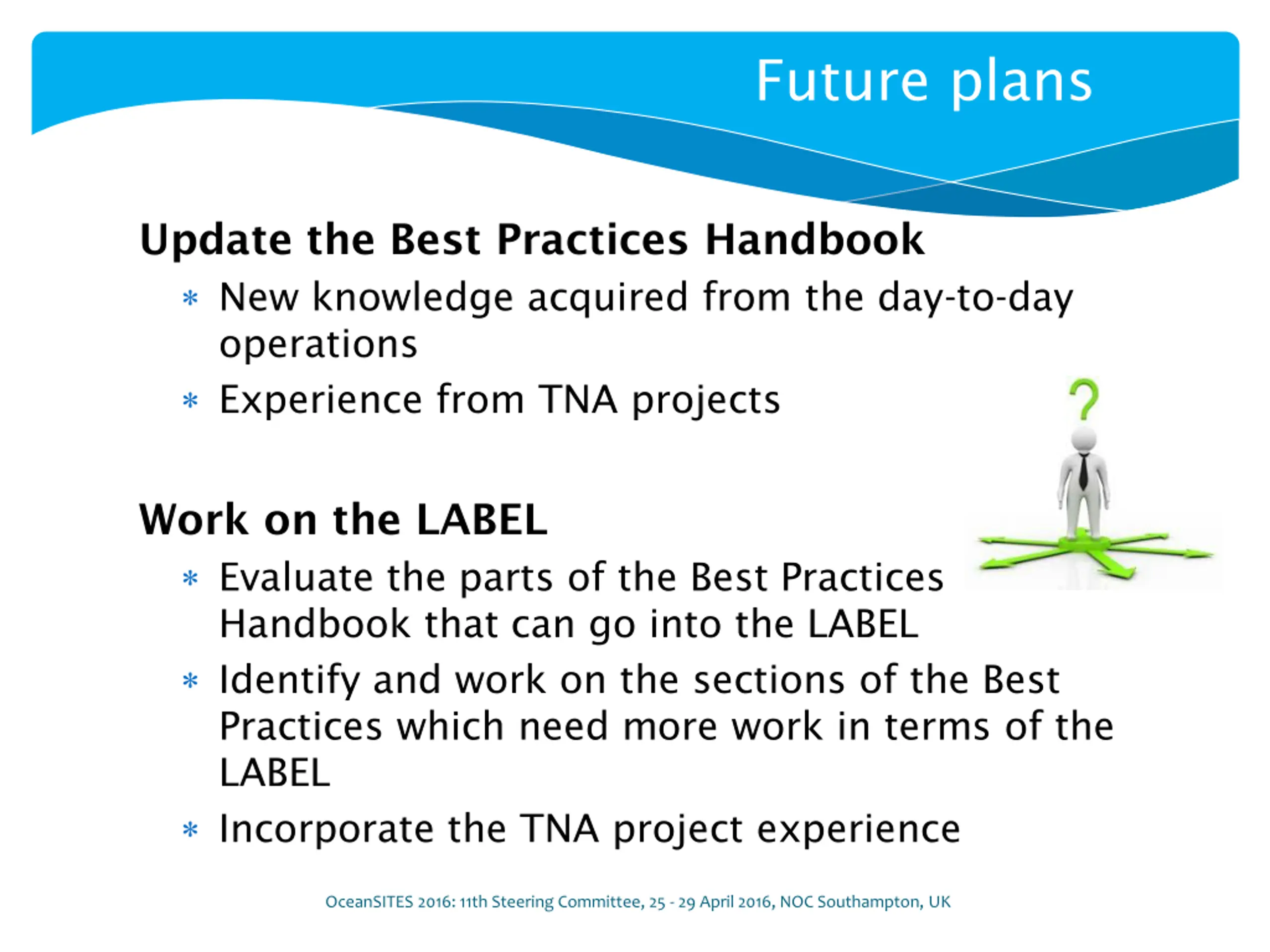 Future plans Update the Best Practices Handbook New knowledge acquired from the day-to-day operations Experience from TNA projects Work on the LABEL Evaluate the parts of the Best Practices Handbook that can go into the LABEL Identify and work on the sections of the Best Practices which need more work in terms of the LABEL Incorporate the TNA project experience OceanSITES 2016: 11th Steering Committee, 25 - 29 April 2016, NOC Southampton, UK