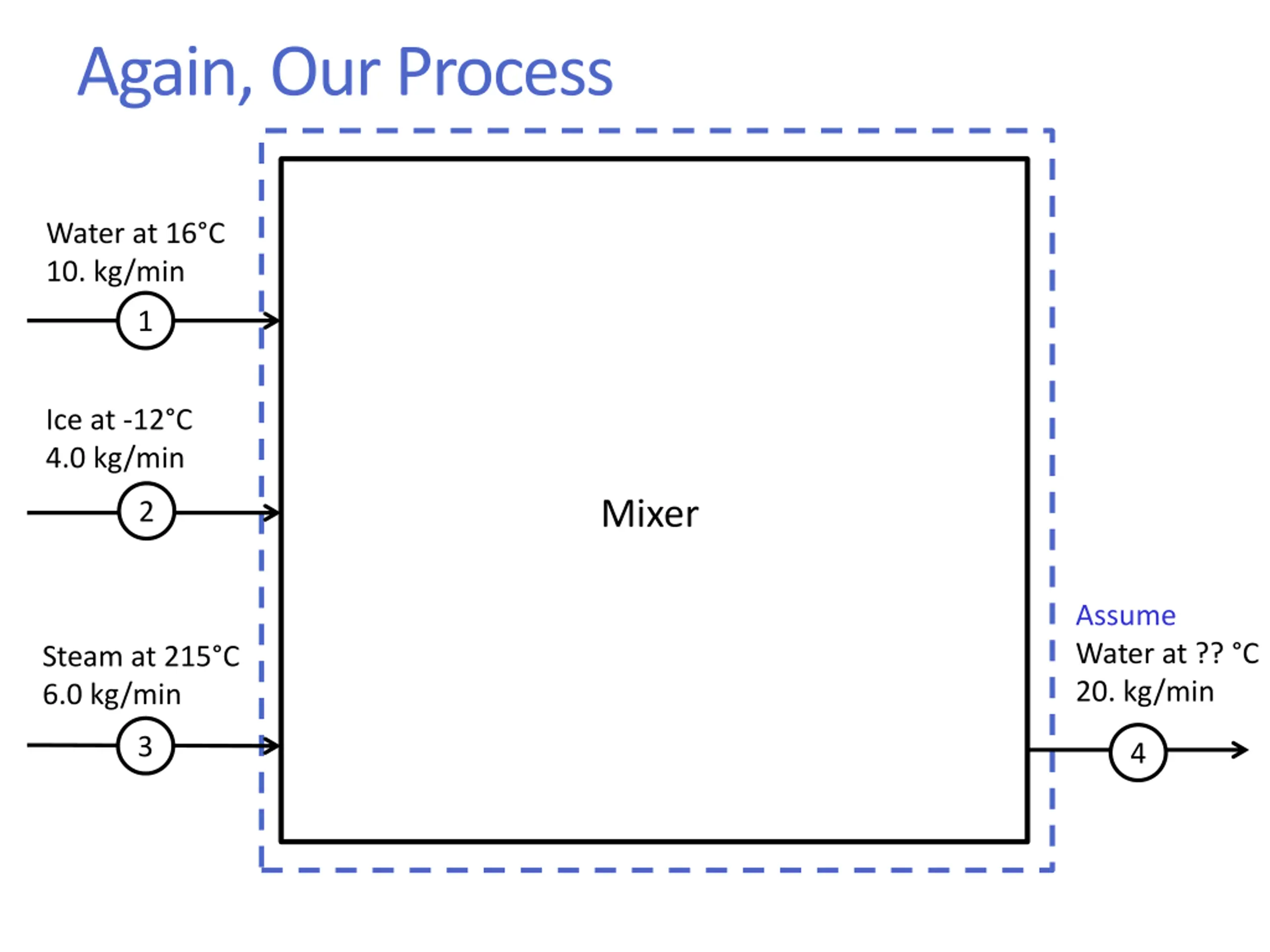 Again, Our Process Water at 16 C 10. kg/min 1 Ice at -12 C 4.0 kg/min Mixer 2 Assume Water at ?? C 20. kg/min Steam at 215 C 6.0 kg/min 3 4