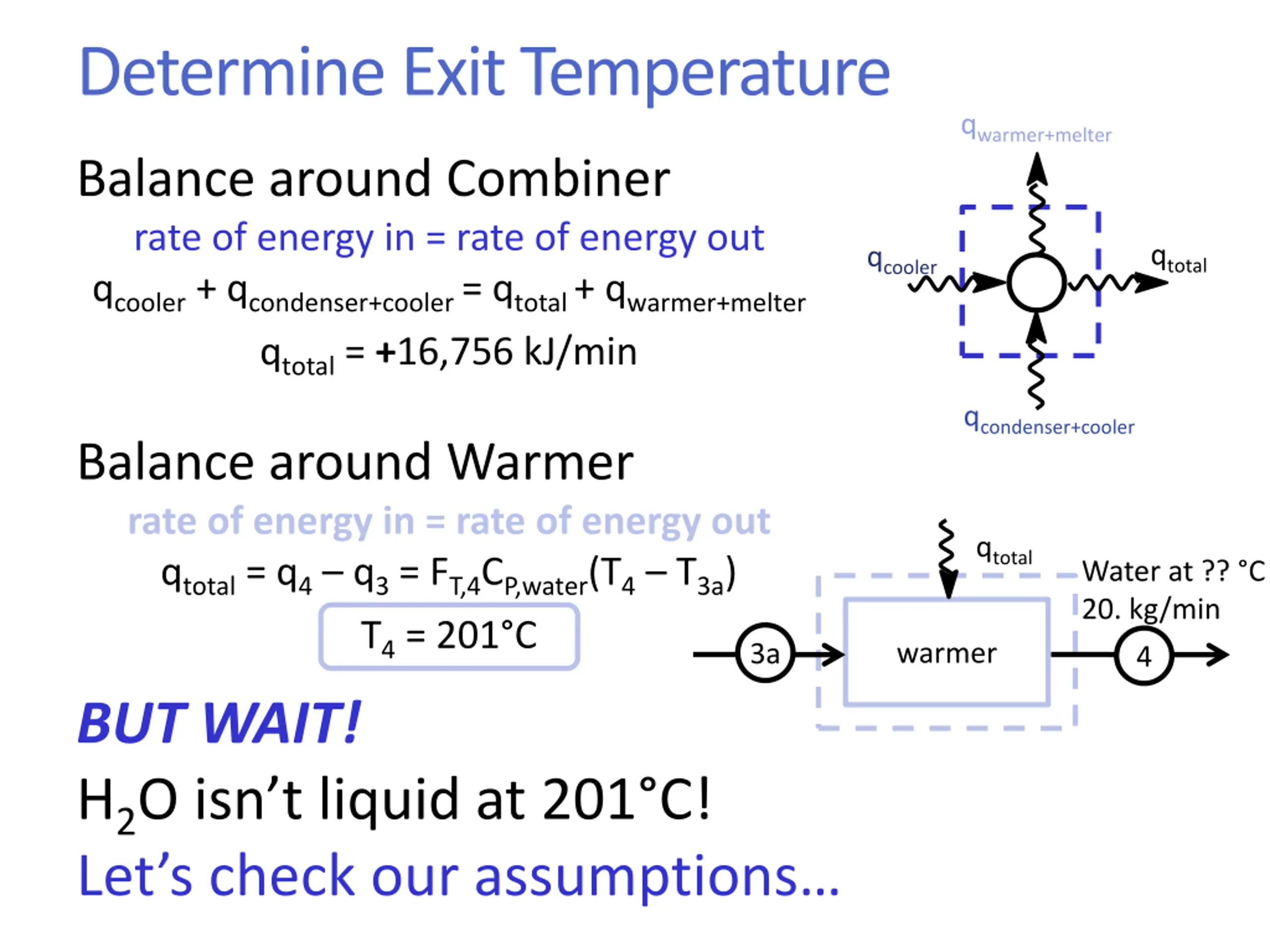 Determine Exit Temperature qwarmer+melter Balance around Combiner rate of energy in = rate of energy out qcooler + qcondenser+cooler= qtotal + qwarmer+melter qtotal = +16,756 kJ/min qtotal qcooler qcondenser+cooler Balance around Warmer rate of energy in = rate of energy out qtotal = q4 q3 = FT,4CP,water(T4 T3a) T4 = 201 C BUT WAIT! H2O isn t liquid at 201 C! Let s check our assumptions qtotal Water at ?? C 20. kg/min warmer 3a 4