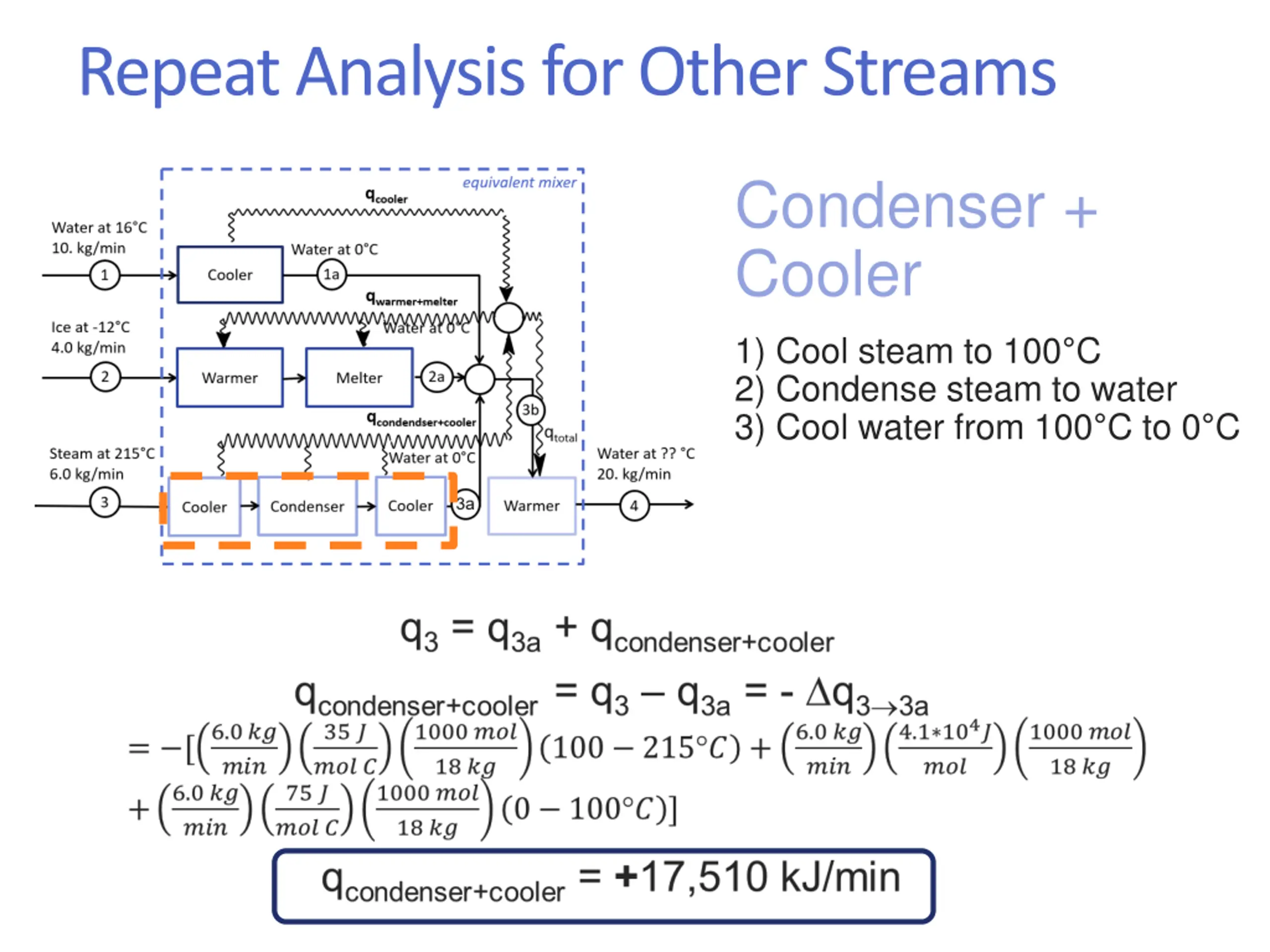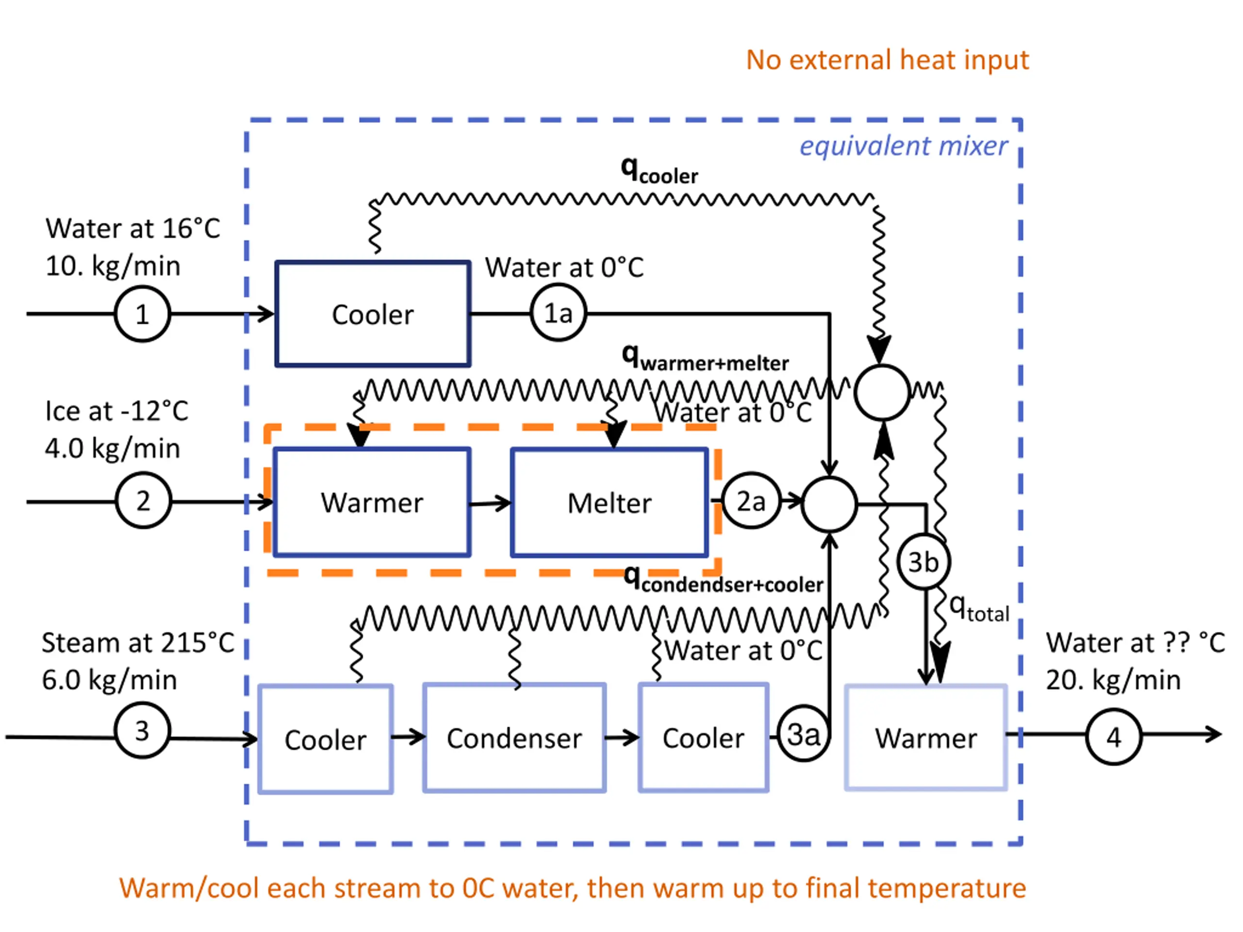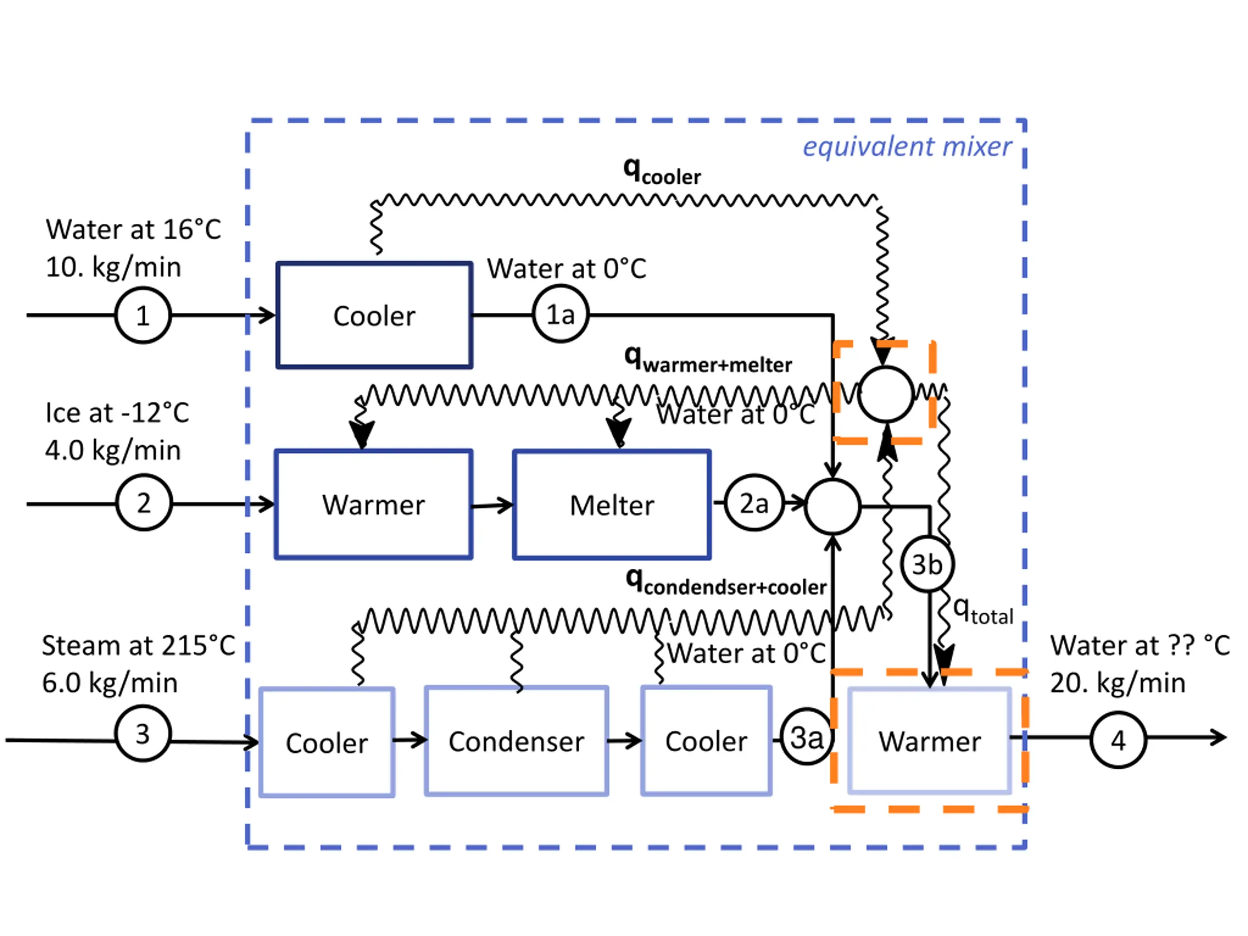equivalent mixer qcooler Water at 16 C 10. kg/min Water at 0 C 1a 1 Cooler qwarmer+melter Ice at -12 C 4.0 kg/min Water at 0 C 2 2a Warmer Melter 3b qcondendser+cooler qtotal Steam at 215 C 6.0 kg/min Water at ?? C 20. kg/min Water at 0 C 3a 3 4 Cooler Warmer Condenser Cooler