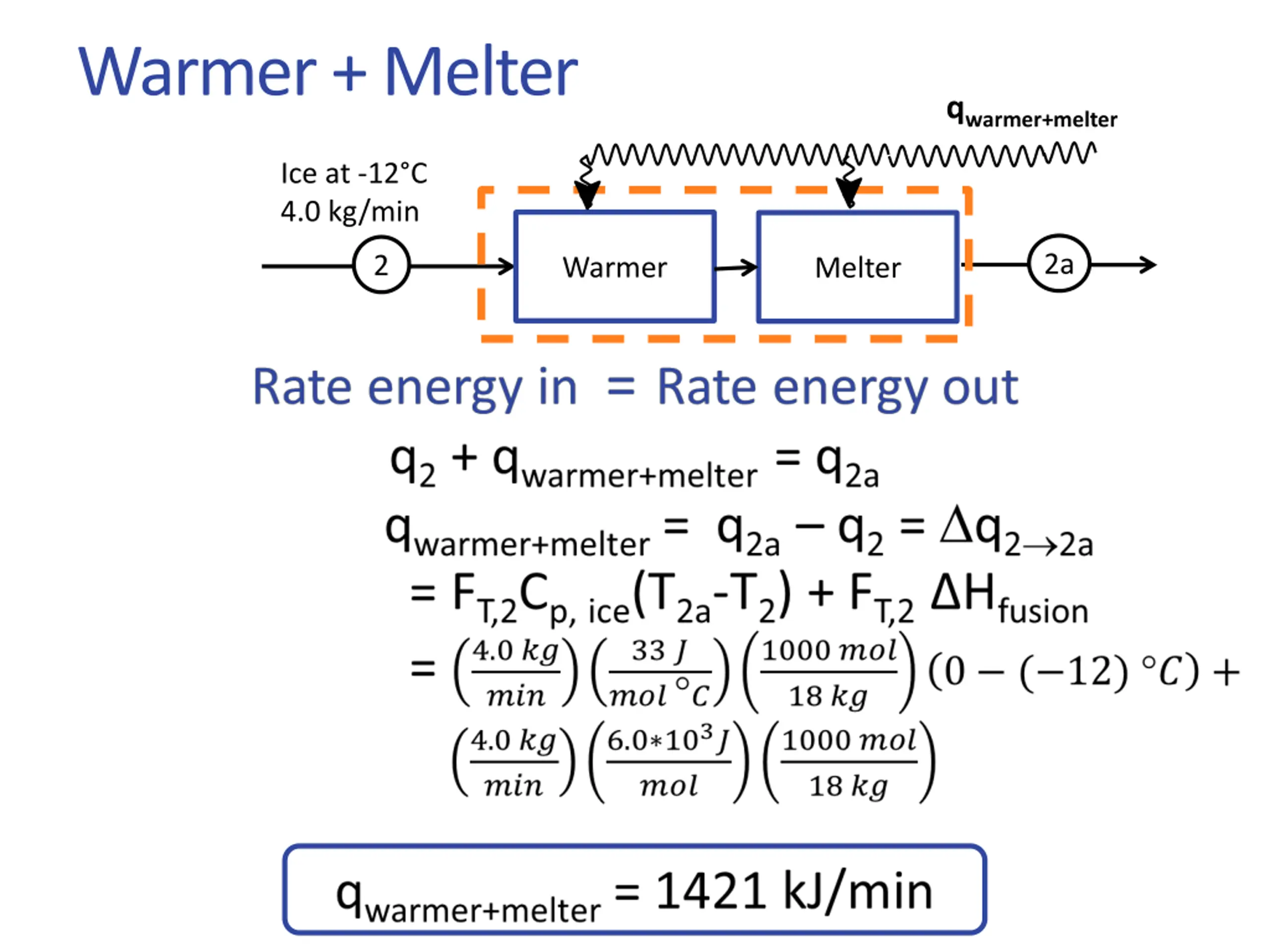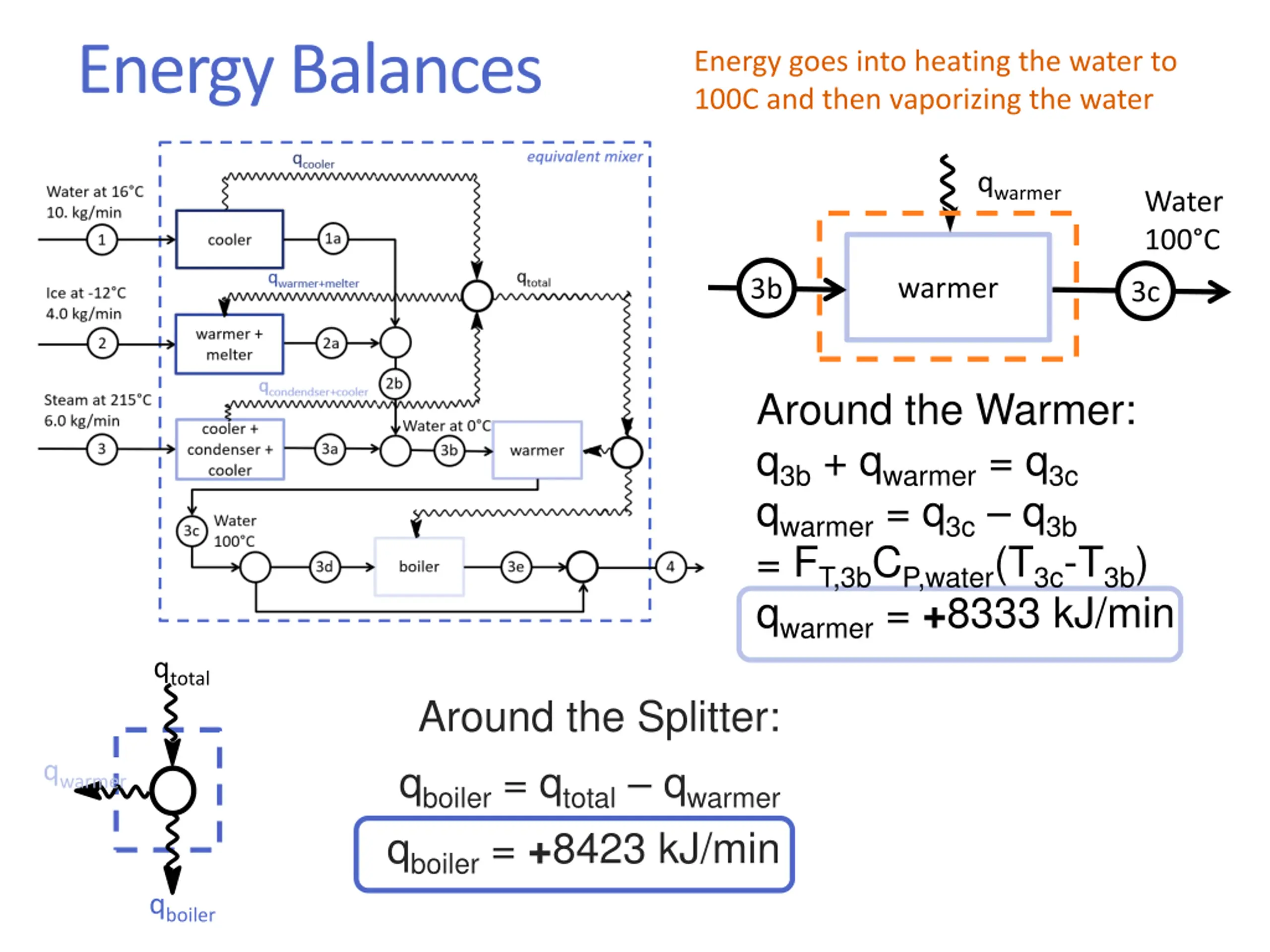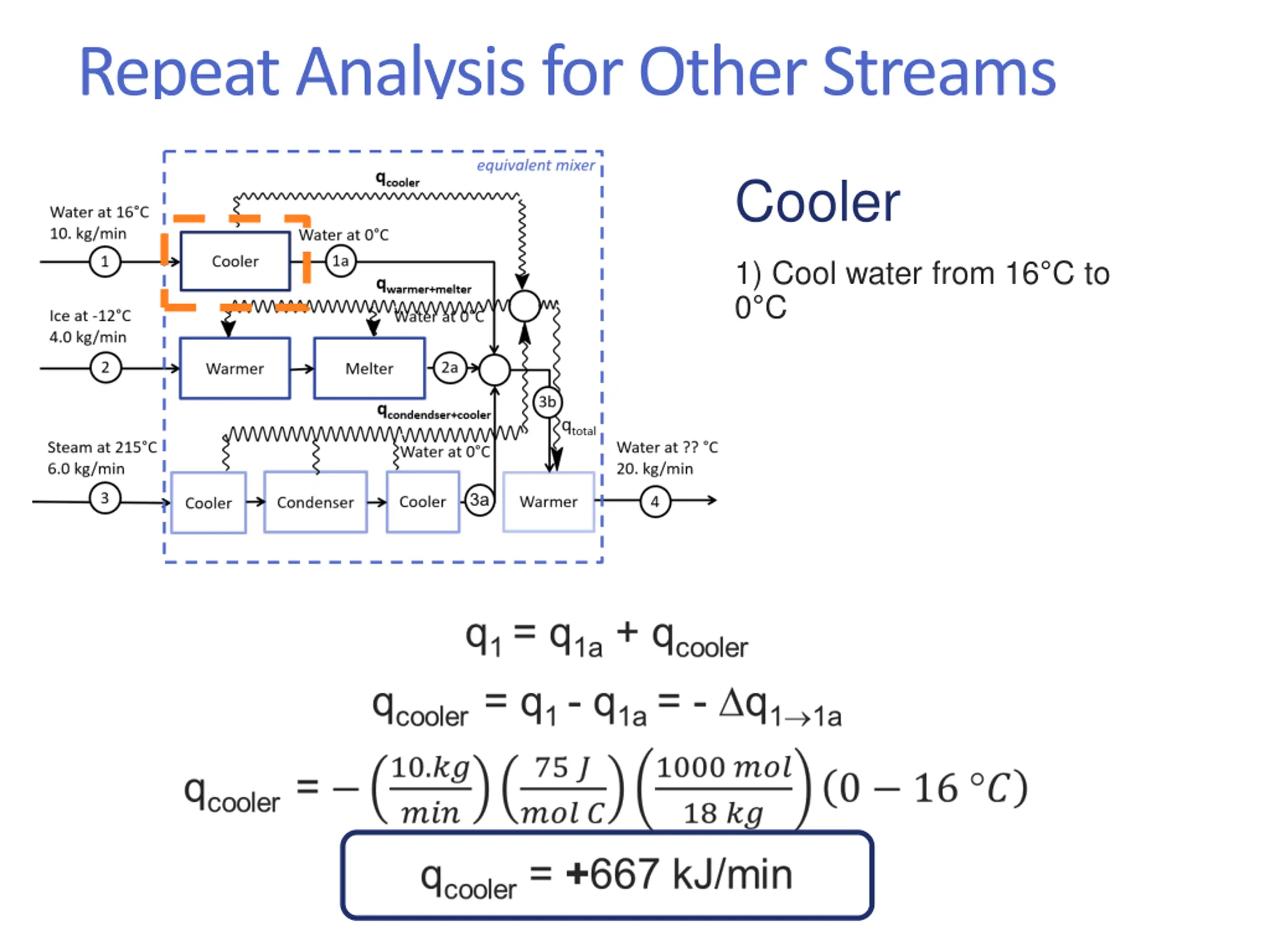 equivalent mixer qcooler Water at 16 C 10. kg/min Water at 0 C 1a 1 Cooler qwarmer+melter Ice at -12 C 4.0 kg/min Water at 0 C 2 2a Warmer Melter 3b qcondendser+cooler qtotal Steam at 215 C 6.0 kg/min Water at ?? C 20. kg/min Water at 0 C 3a 3 4 Cooler Warmer Condenser Cooler