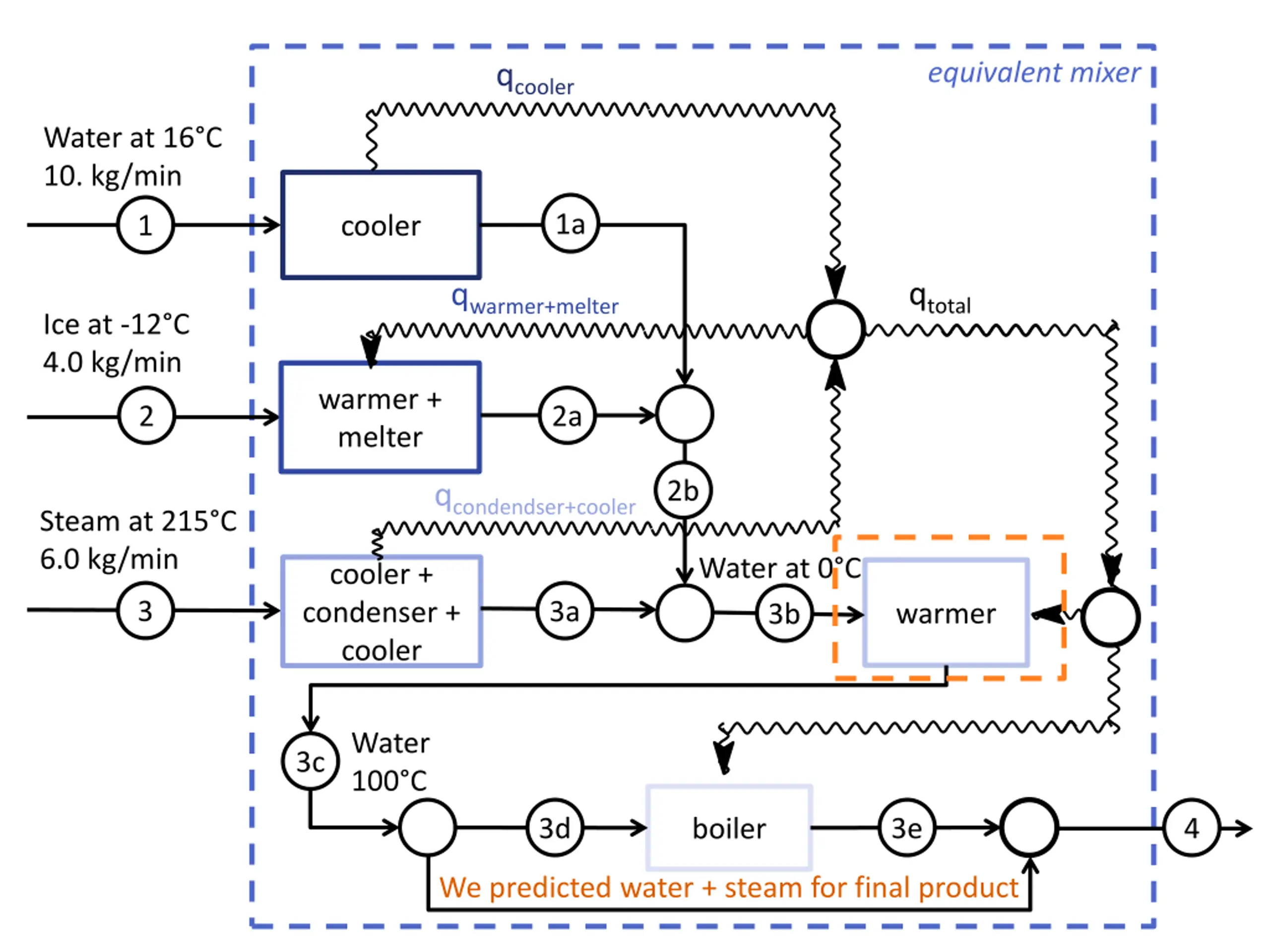 equivalent mixer qcooler Water at 16 C 10. kg/min 1a 1 cooler qtotal qwarmer+melter Ice at -12 C 4.0 kg/min warmer + melter 2 2a 2b qcondendser+cooler Steam at 215 C 6.0 kg/min Water at 0 C cooler + condenser + cooler 3 3a warmer 3b Water 100 C 3c 3d 3e 4 boiler We predicted water + steam for final product