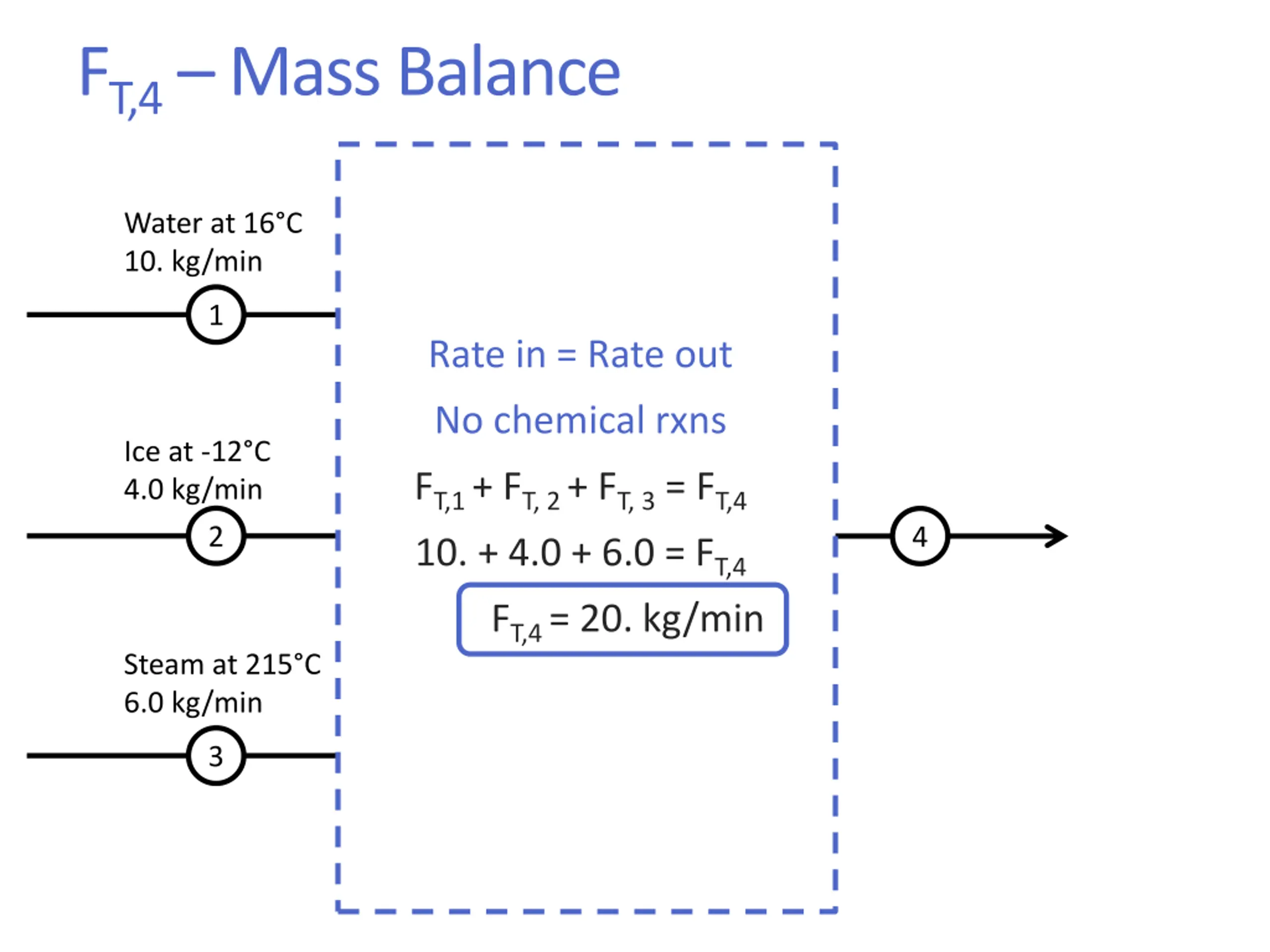 FT,4 Mass Balance Water at 16 C 10. kg/min 1 Rate in = Rate out No chemical rxns Ice at -12 C 4.0 kg/min FT,1 + FT, 2 + FT, 3 = FT,4 10. + 4.0 + 6.0 = FT,4 FT,4 = 20. kg/min 2 4 Mixer Steam at 215 C 6.0 kg/min 3