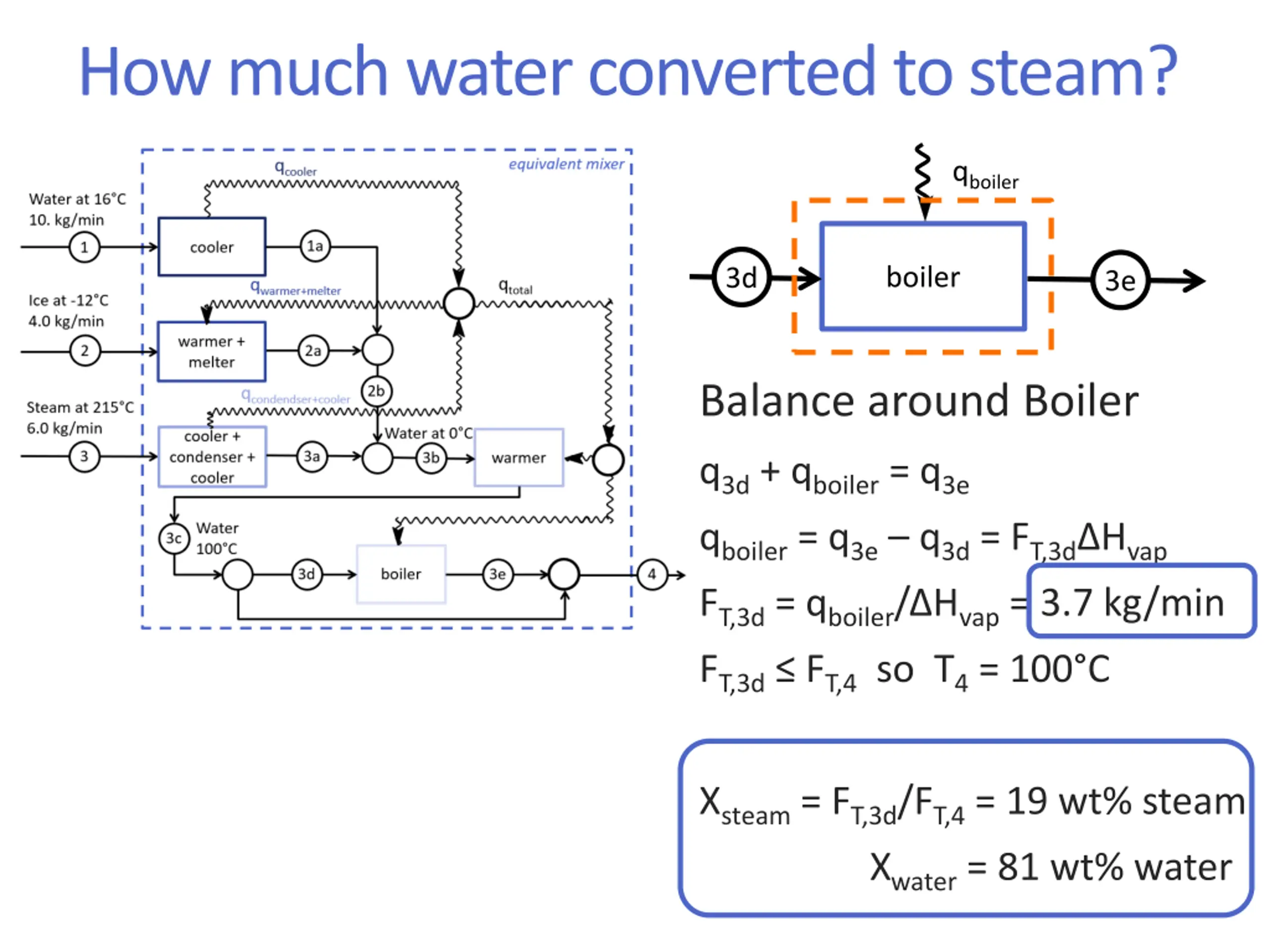 How much water converted to steam? qboiler boiler 3d 3e Balance around Boiler q3d + qboiler = q3e qboiler = q3e q3d = FT,3d Hvap FT,3d = qboiler/ Hvap = 3.7 kg/min FT,3d FT,4 so T4 = 100 C Xsteam = FT,3d/FT,4 = 19 wt% steam Xwater = 81 wt% water