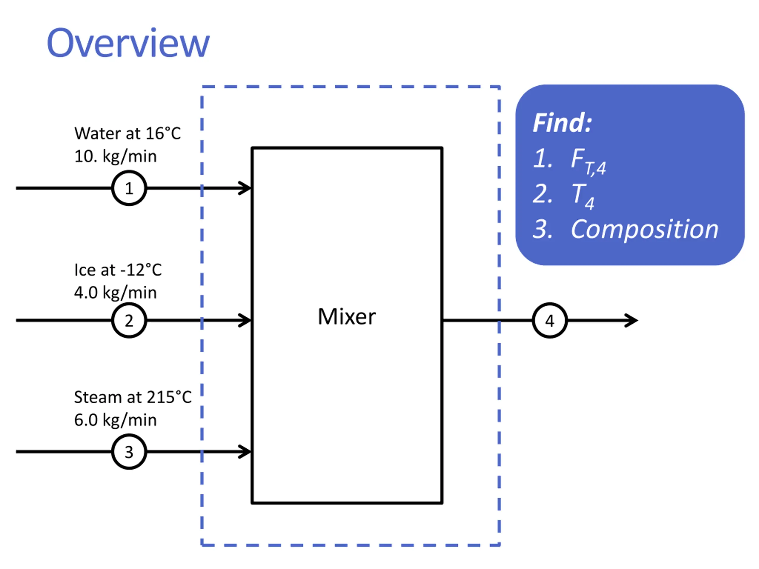 Overview Find: 1. FT,4 2. T4 3. Composition Water at 16 C 10. kg/min 1 Ice at -12 C 4.0 kg/min Mixer 2 4 Steam at 215 C 6.0 kg/min 3