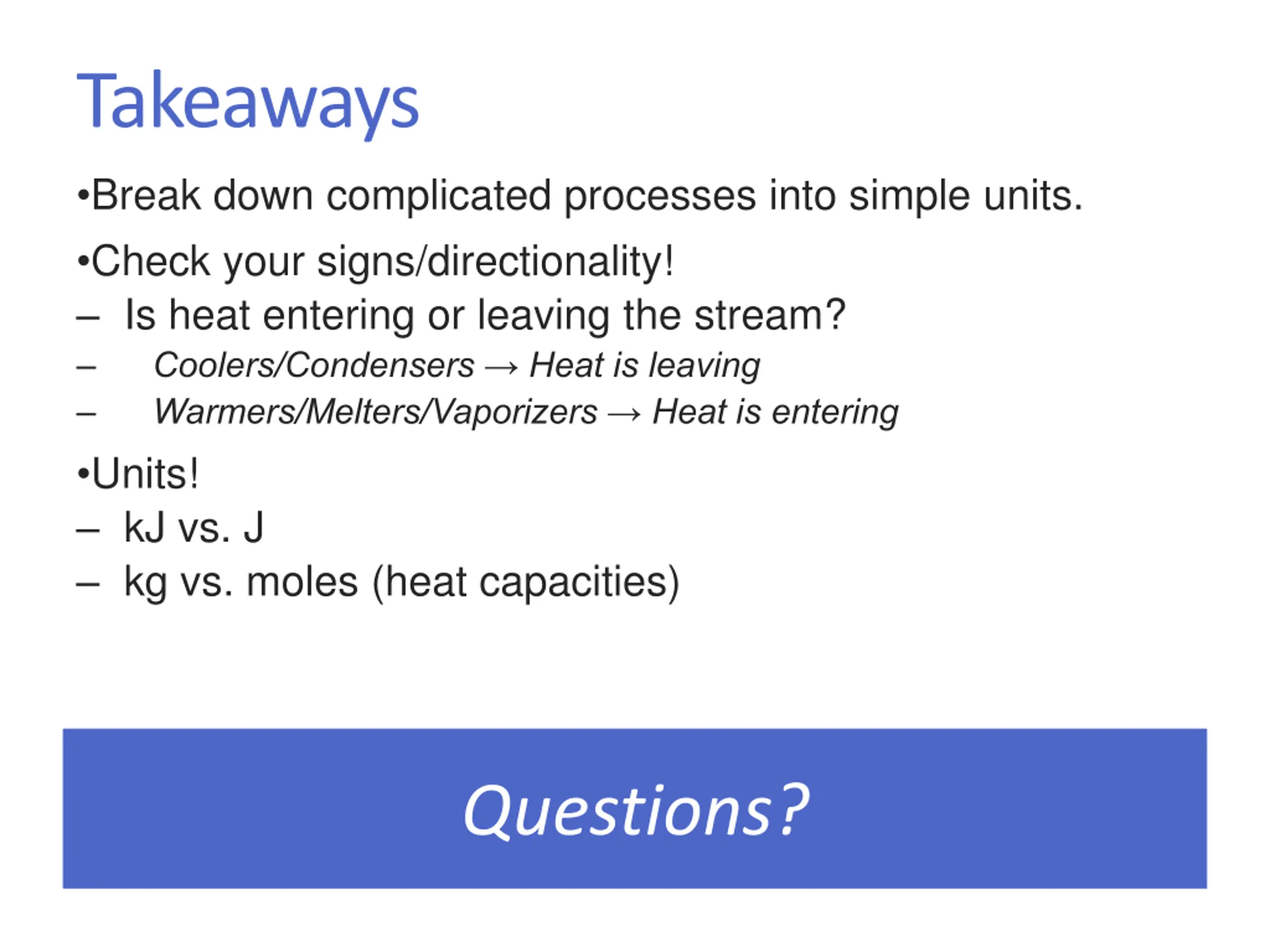 Takeaways Break down complicated processes into simple units. Check your signs/directionality! Is heat entering or leaving the stream? Coolers/Condensers Heat is leaving Warmers/Melters/Vaporizers Heat is entering Units! kJ vs. J kg vs. moles (heat capacities) Questions?