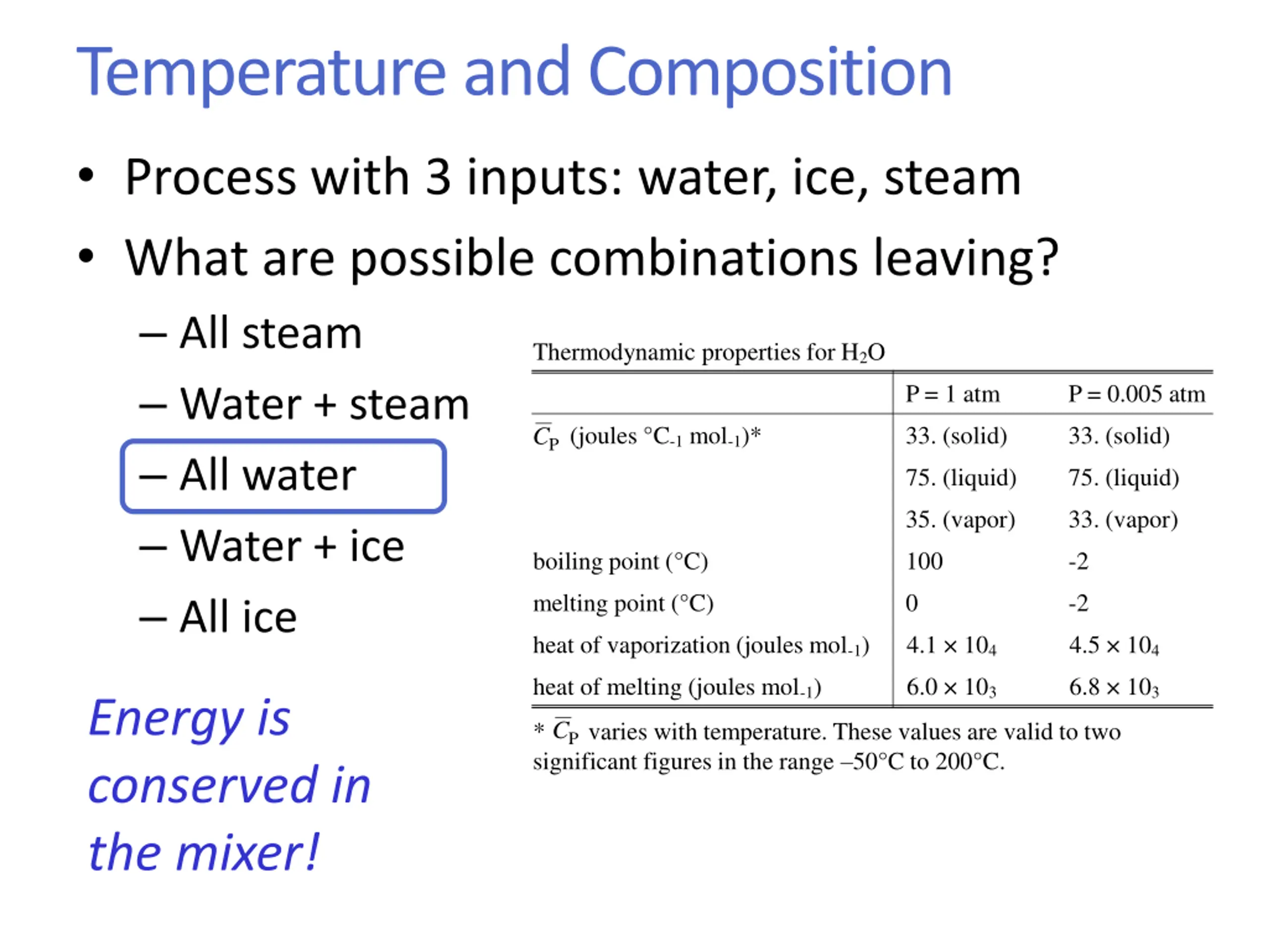 Temperature and Composition Process with 3 inputs: water, ice, steam What are possible combinations leaving? All steam Water + steam All water Water + ice All ice heat of vaporization (joules mol-1) Thermodynamic properties for H2O P = 1 atm P = 0.005 atm (joules C-1 mol-1)* 33. (solid) 33. (solid) C P 75. (liquid) 75. (liquid) 35. (vapor) 33. (vapor) boiling point ( C) 100 -2 melting point ( C) 0 -2 4.1 104 4.5 104 heat of melting (joules mol-1) 6.0 103 6.8 103 Energy is conserved in the mixer! C * varies with temperature. These values are valid to two significant figures in the range 50 C to 200 C. P